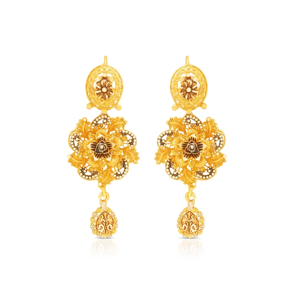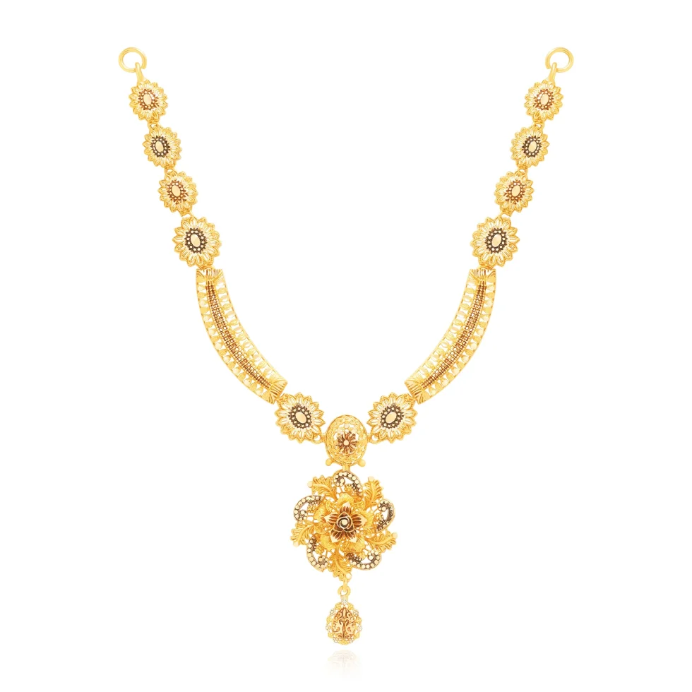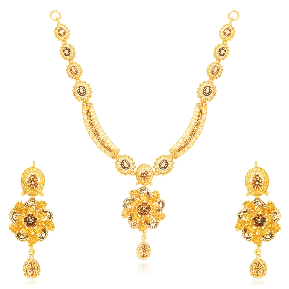 This necklace set features a graceful sequence of floral gold links flowing into finely textured curved panels. The ornate central floral pendant, finished with a delicate gold drop, is complemented by matching earrings, creating a balanced and regal look ideal for weddings and formal celebrations.