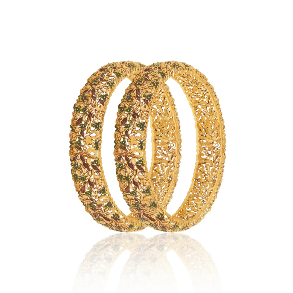 An opulent gold kara pair showcasing sculpted floral artistry, intricate filigree work, and finely detailed borders. Crafted with traditional precision, this statement pair reflects a powerful heritage aesthetic while offering enduring elegance for bridal and ceremonial wear.