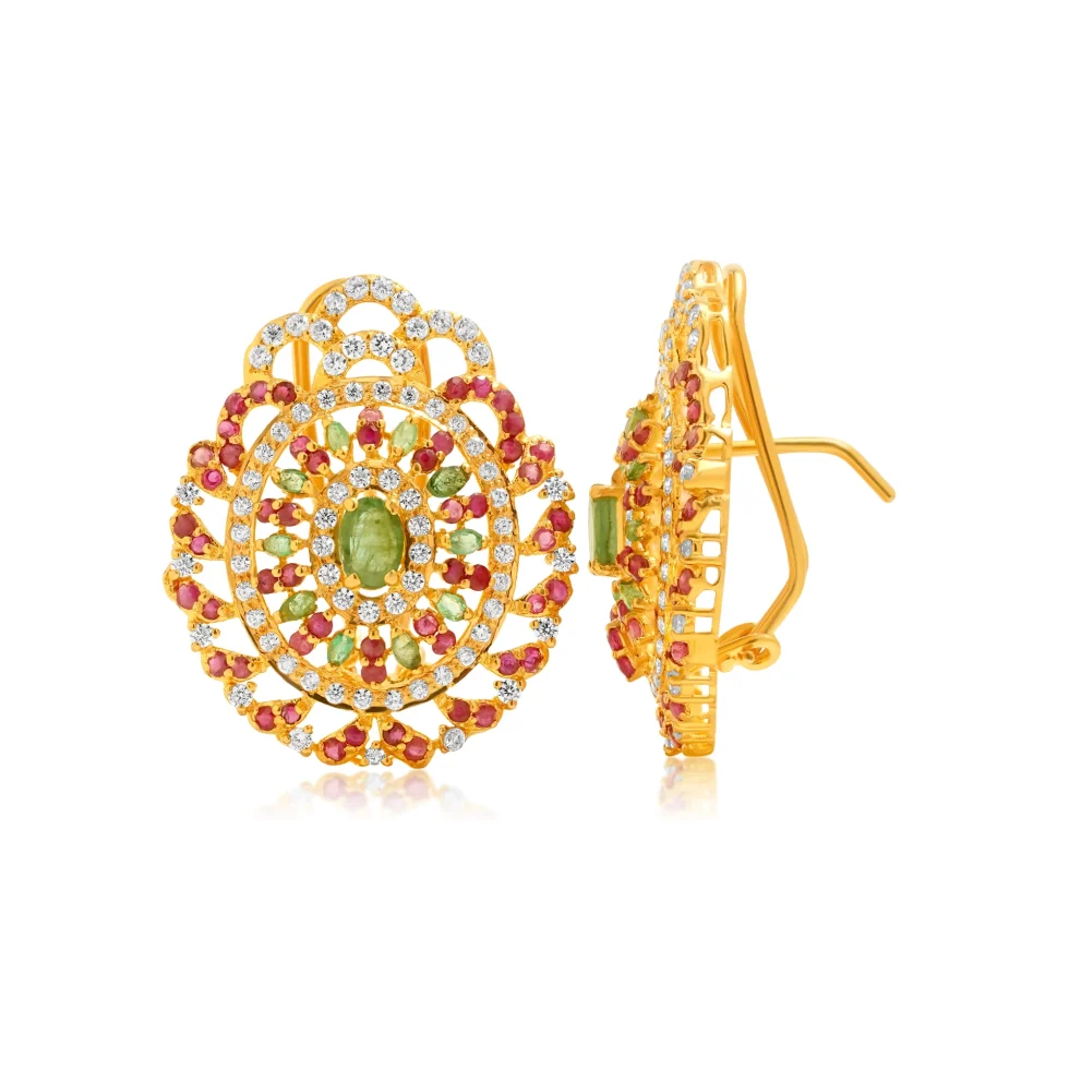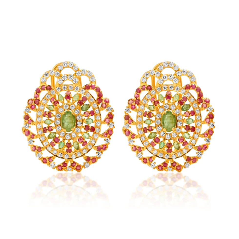 Inspired by Mughal floral motifs, these tops feature a blooming arrangement of white, red, and green stones set in rich gold. The intricate detailing creates a dazzling, multidimensional sparkle perfect for grand occasions.