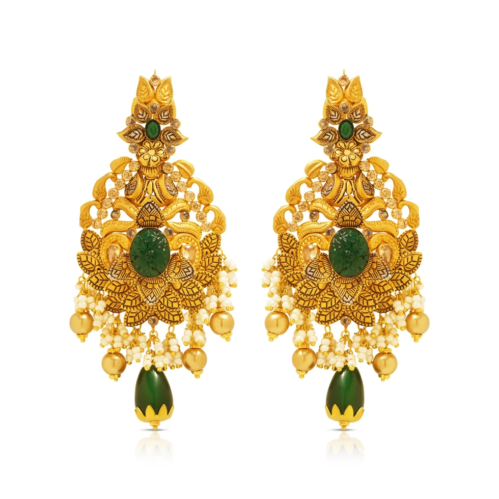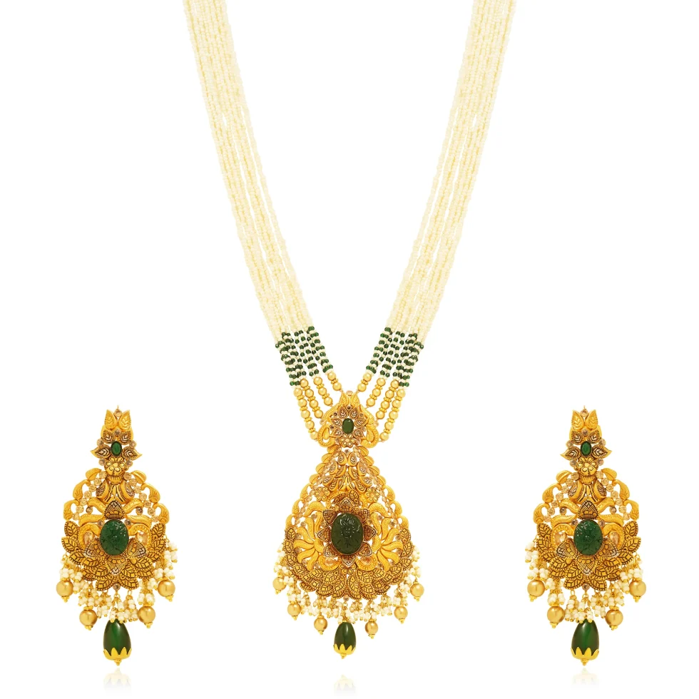 Multiple strings of ivory and green beads flow into a handcrafted gold pendant embellished with floral engravings and emerald accents. A luxurious ensemble designed for brides who embrace rich cultural heritage.