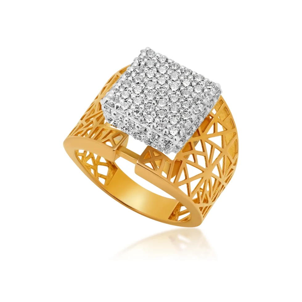 This ring is a striking expression of bold design, where geometry and artistry meet in perfect harmony. An elevated square centerpiece rises proudly above the band, creating a crown-like presence that draws immediate attention. Its openwork gold frame, crafted with intricate lattice patterns.