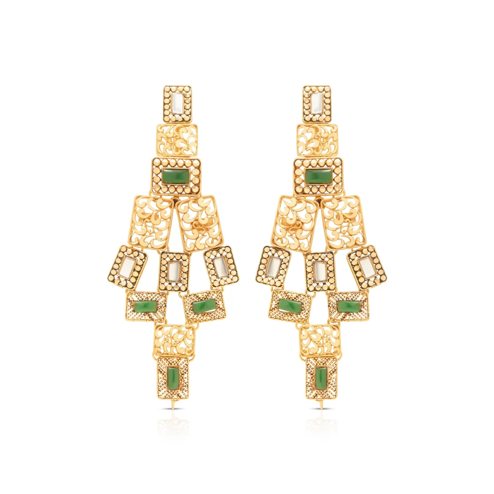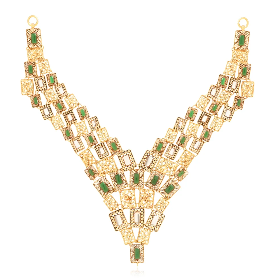 Featuring an intricate grid of textured gold panels and rectangular emeralds, this necklace set stands out for its architectural elegance. The cascading V-structure frames the neckline with strength and sophistication ideal for a bride seeking contemporary luxury.