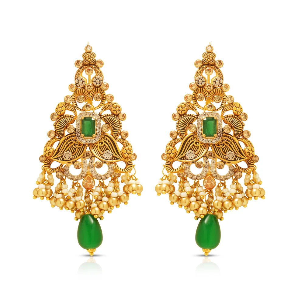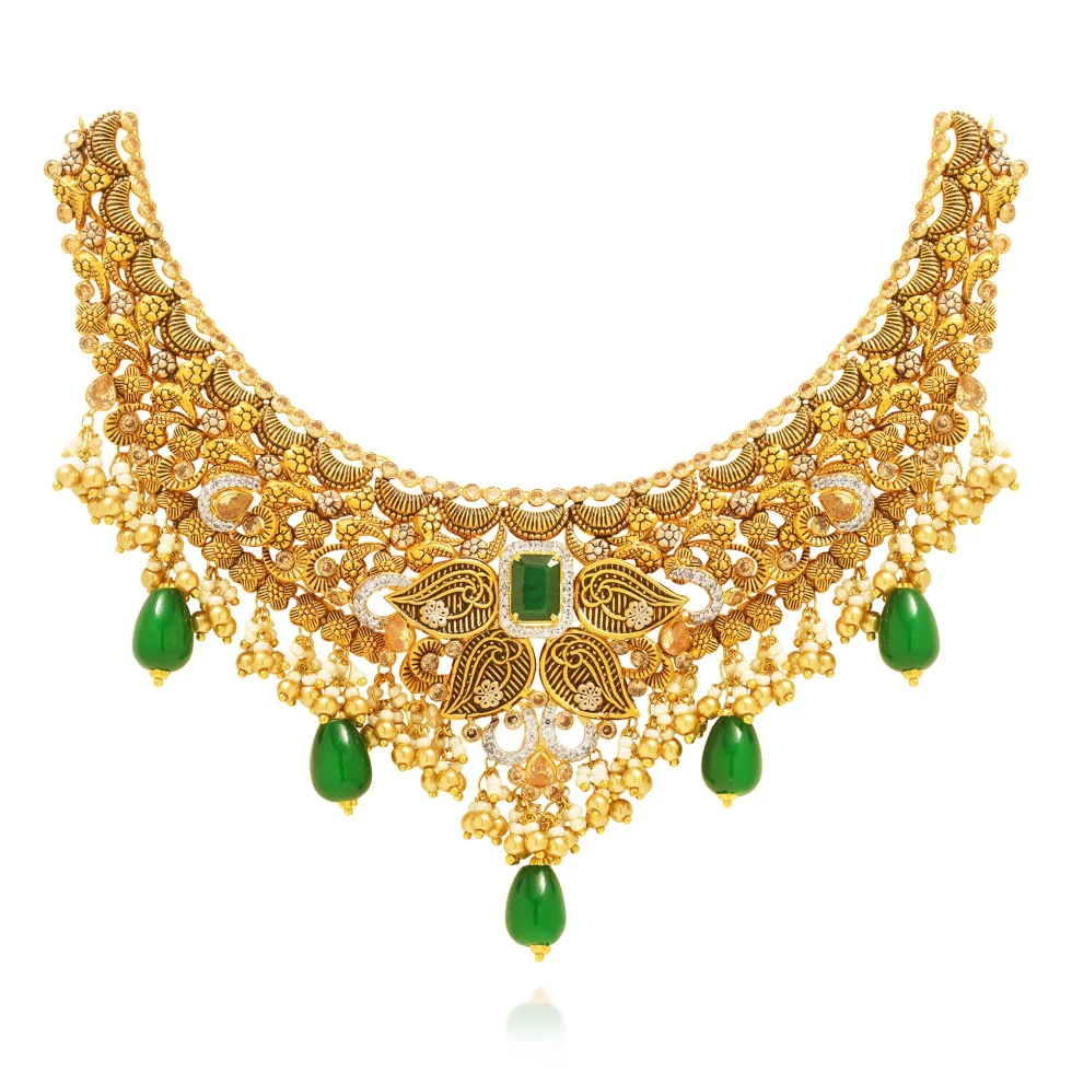 An opulent gold necklace set crafted with intricate filigree, floral motifs, and exquisite hand-carved detailing. The crescent collar features a dense tapestry of textured petals, swirling vines, and scalloped floral patterns, creating a rich heritage aesthetic.