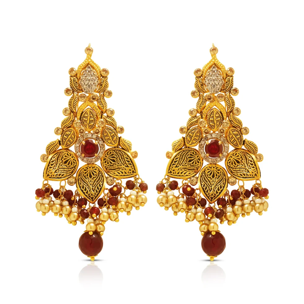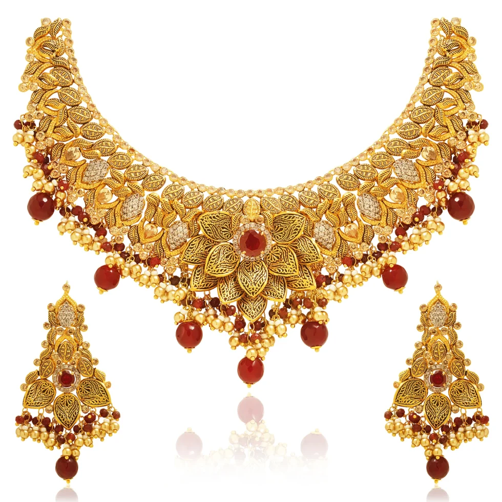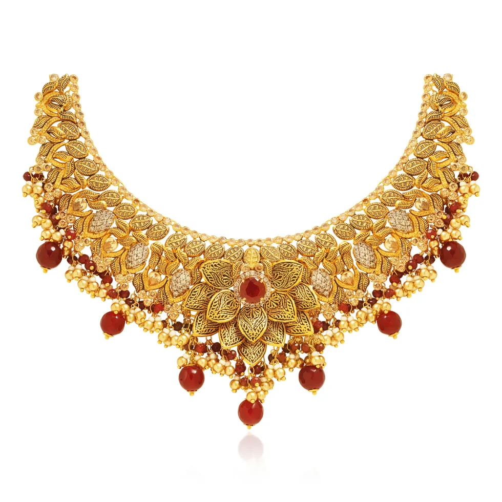 A striking heritage necklace set crafted with layered artistry and regal finesse. The design features an intricate tapestry of hand-carved leaves, textured petals, and luminous gold detailing, all arranged in a bold crescent silhouette. At the center, a grand floral medallion is crowned with a deep red stone, adding richness and dramatic allure.