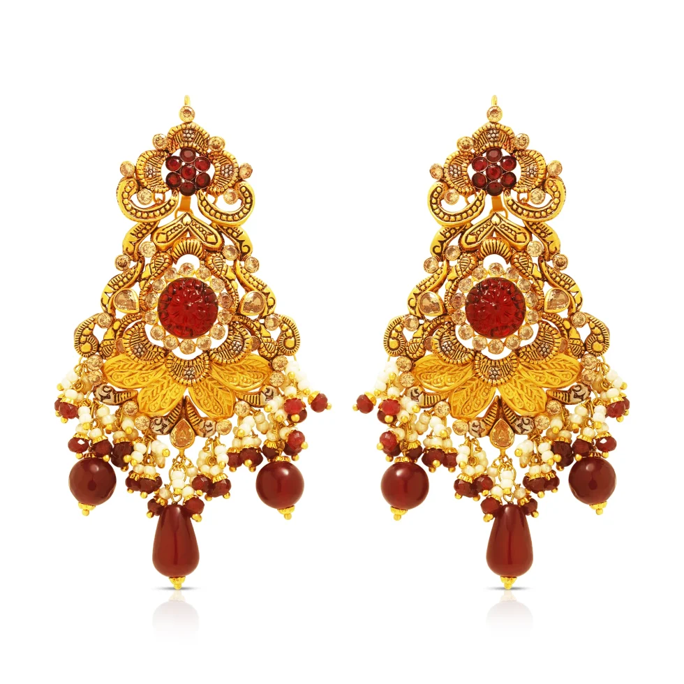 This striking set features multi-layer beads in soft creams and rich reds, culminating in a handcrafted pendant adorned with a textured ruby centerpiece. Elegant and commanding, designed for brides who love deep, royal tones.