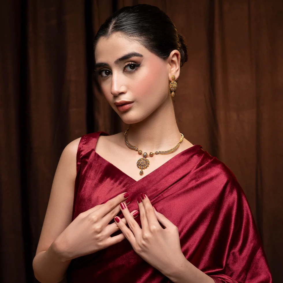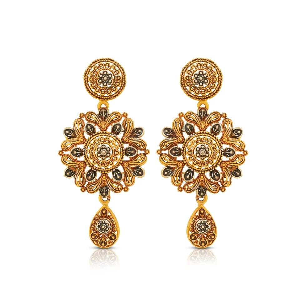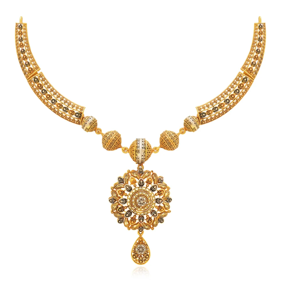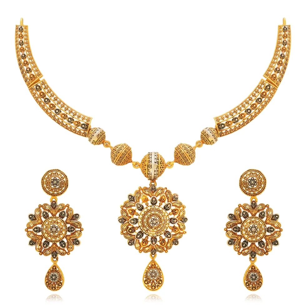 An ornate celebration of heritage artistry, this set features a grand central medallion shaped like a sunburst mandala, enriched with antique-finish petals and textured gold detailing. The neckline is crafted with sculpted, dome-shaped beads and intricately patterned bars, giving it a bold, regal presence.
