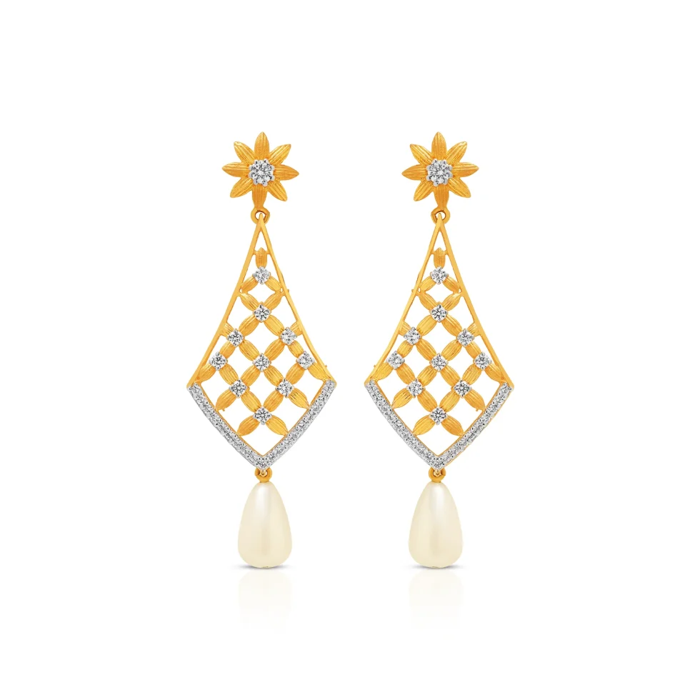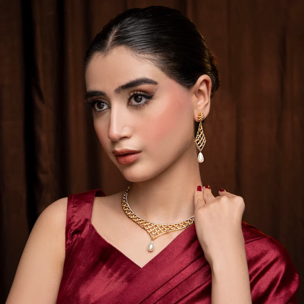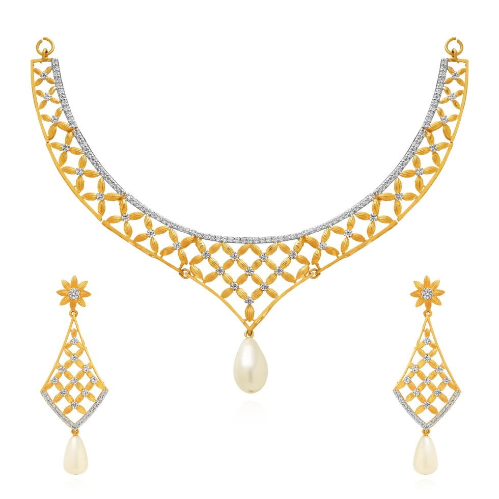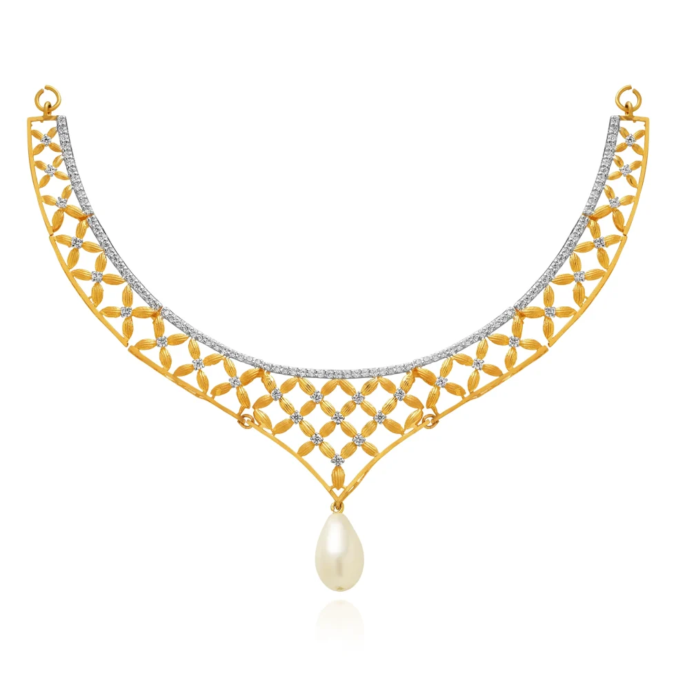 A delicate interplay of floral motifs and diamond-cut detailing forms a graceful lattice that wraps effortlessly around the neckline. Each petal-like segment is joined with shimmering accents, creating a refined dual-tone glow. Light, intricate, and timeless an ideal choice for modern celebrations and elegant evening wear.