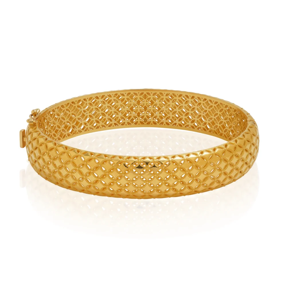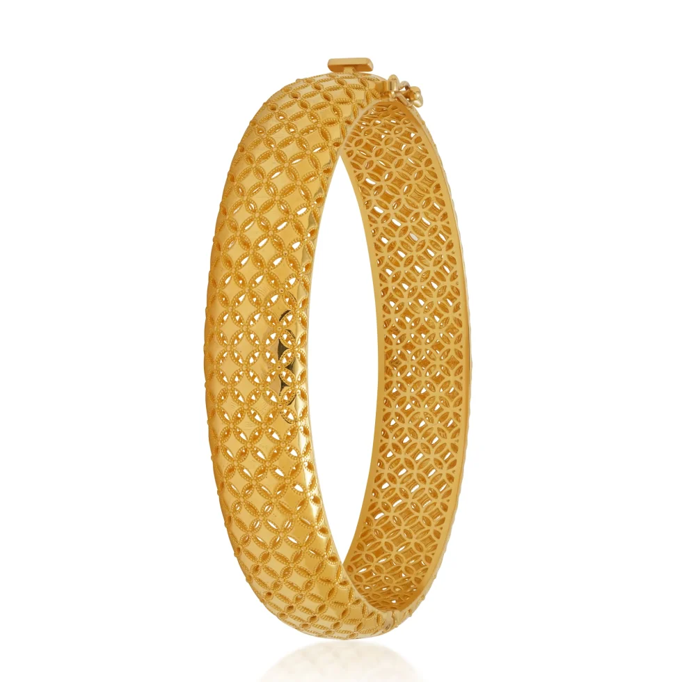 The Lattice Glow Kara showcases masterful craftsmanship through its intricate interwoven gold pattern. Each detail forms a seamless texture of light and shadow, symbolizing unity, grace, and strength. Designed with timeless appeal, this kara radiates elegance a perfect harmony of tradition and modern artistry that complements every occasion.