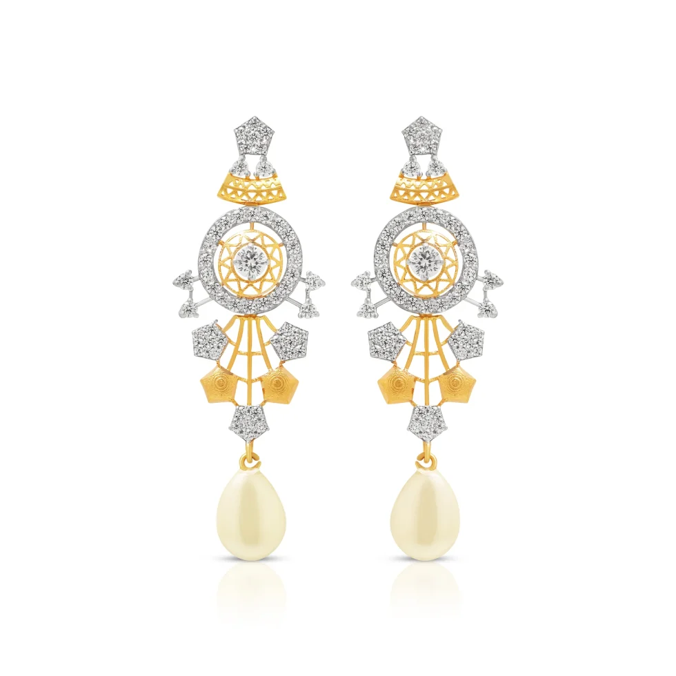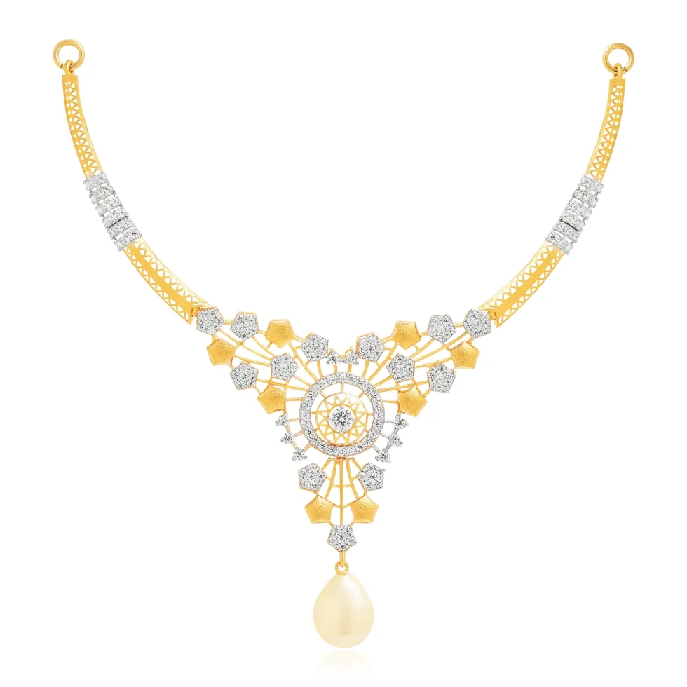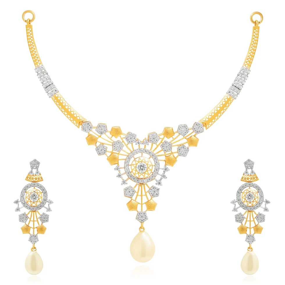 Defined by its refined lattice framework and geometric symmetry, this gold necklace set balances intricate detailing with graceful flow. These accents enhance the centerpiece, while the pearl drop provides a classic finishing touch. The matching earrings mirror the design, offering a polished and harmonious statement.
