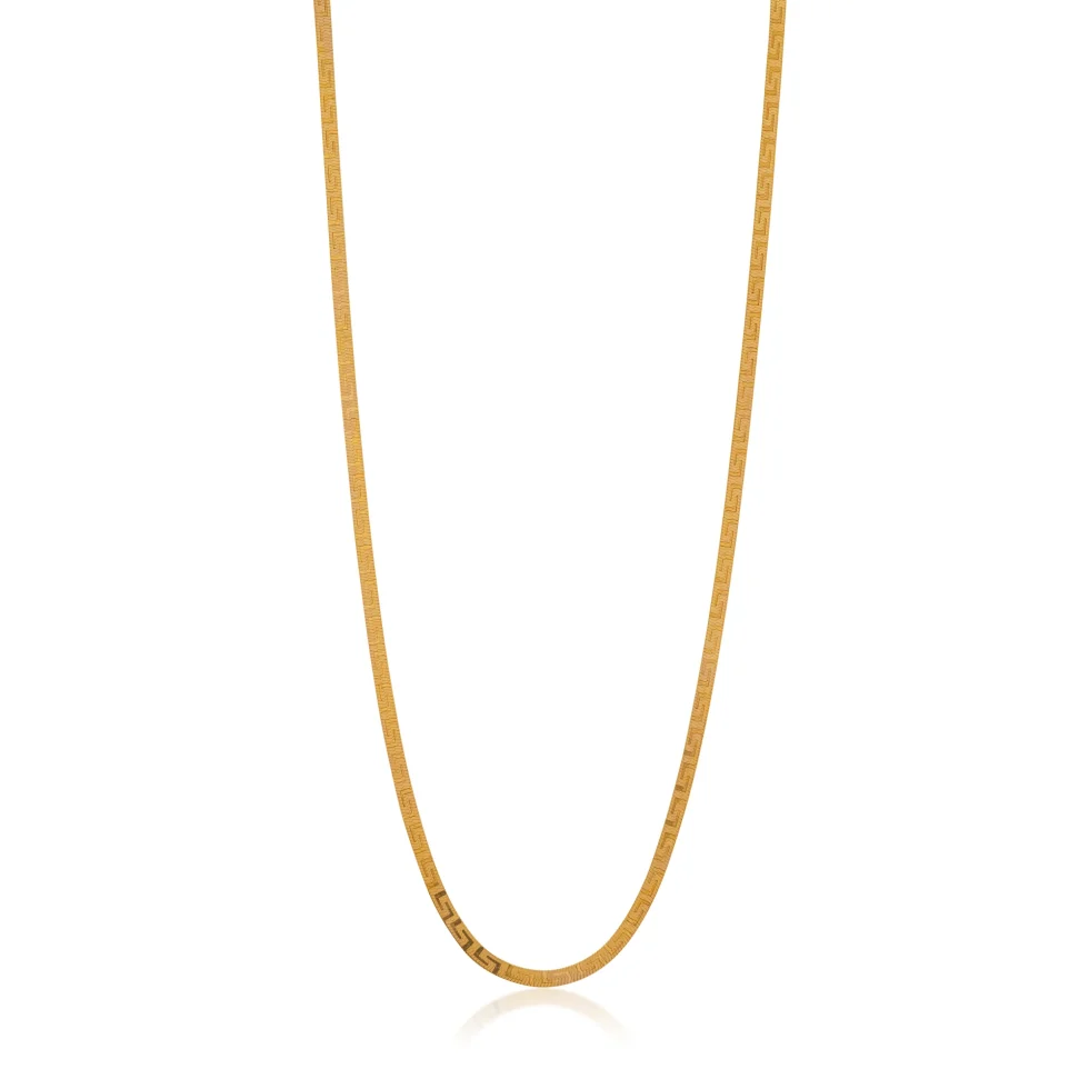 Designed with a unique linear pattern embedded along its surface, this chain brings texture, depth, and a distinguished finish. Lightweight yet striking, it stands beautifully on its own or layered for a modern statement.