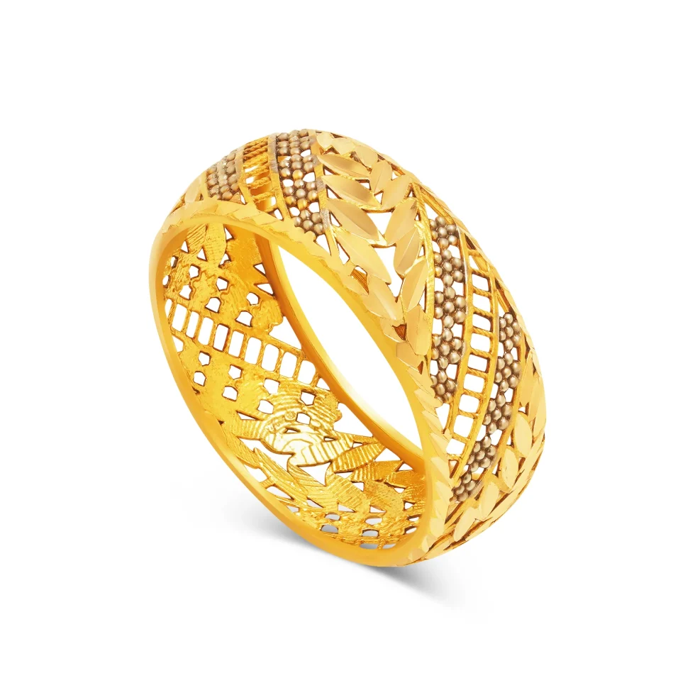 A refined blend of sculpted leaf motifs and airy mesh filigree creates a beautifully illuminated look in the LuminLeaf Mesh Ring. Each leaf is delicately carved and enhanced with soft dual-tone shading, adding depth and visual warmth to the design