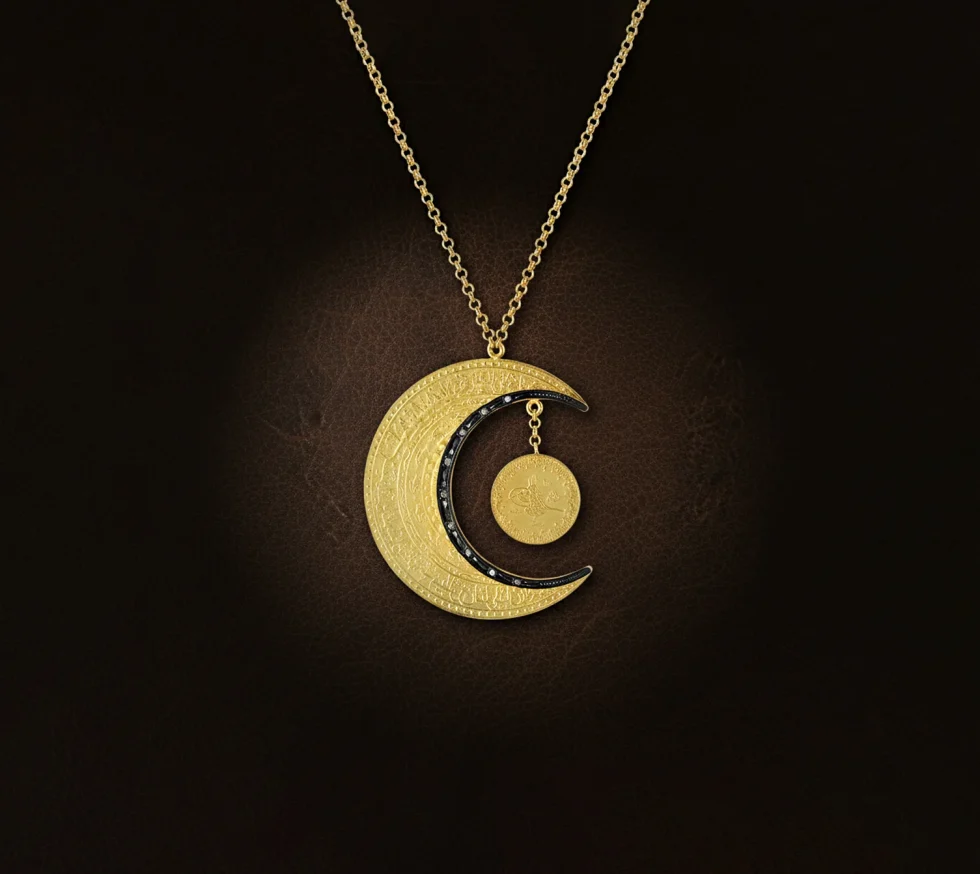 The crescent has long symbolised spirituality, protection, and divine guidance in Islamic culture. Suspended at its centre, an Islamic coin represents faith, blessing, and continuity. This gold pendant brings together sacred symbolism and historic meaning in a timeless expression of devotion and heritage.