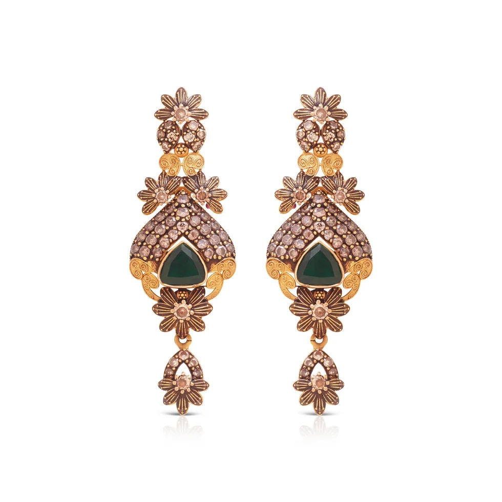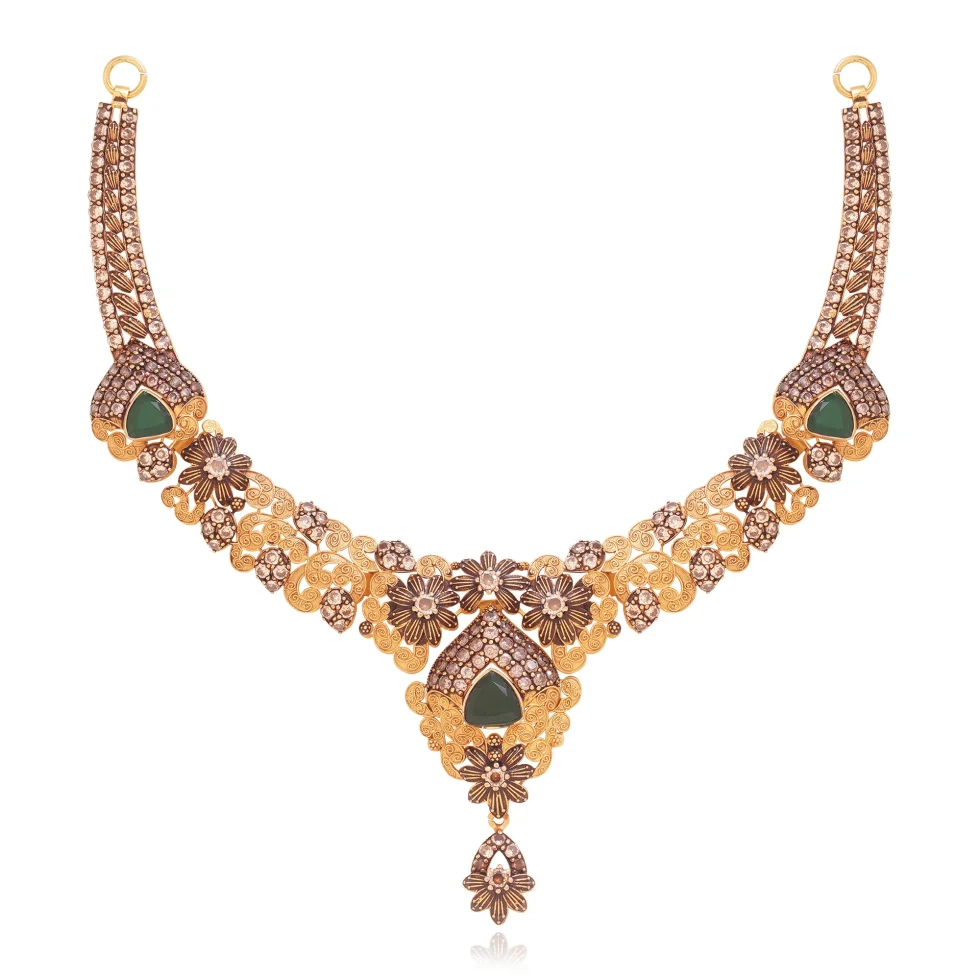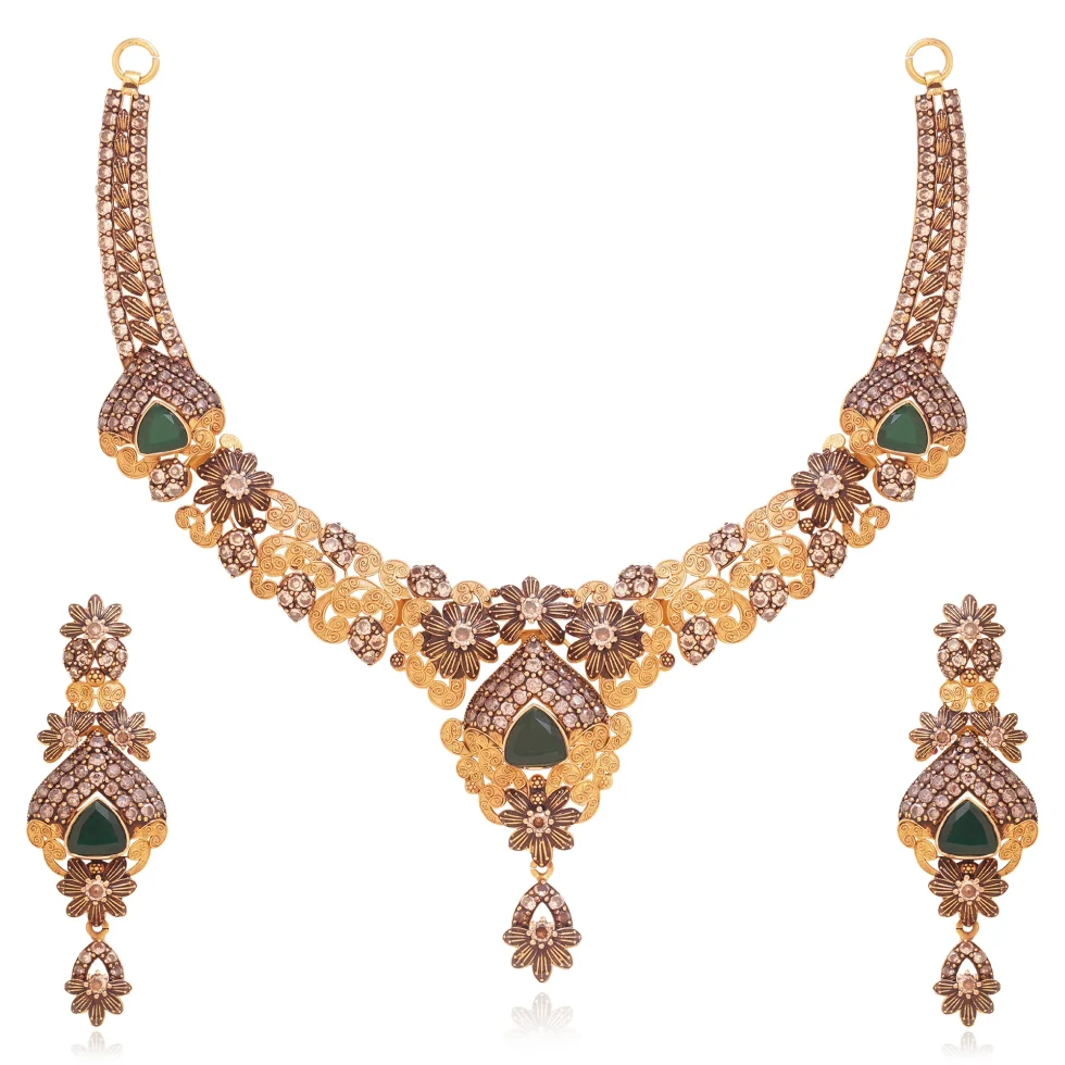 A striking composition of floral gold craftsmanship and deep green gemstone accents, the Majestic Emerald Set offers a bold yet graceful presence. Ideal for weddings and grand celebrations.