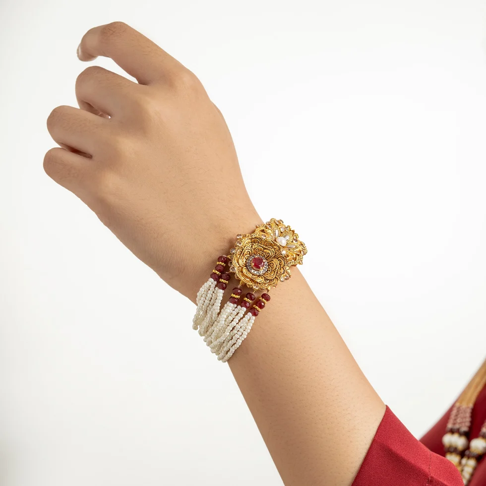 This bracelet celebrates floral grandeur through intricate gold artistry, where every petal and motif is sculpted with exceptional detail. Ruby-red accents bring a vibrant depth to the design, evoking the richness of royal treasures, while the soft strands of pearl provide a graceful balance.