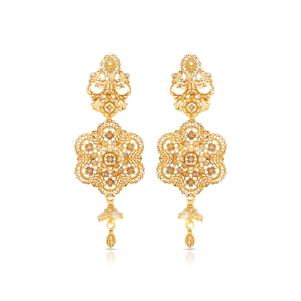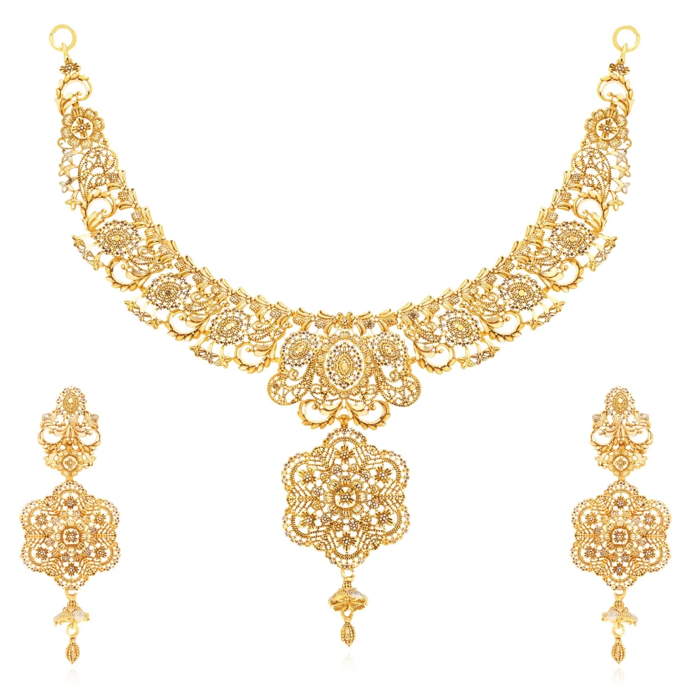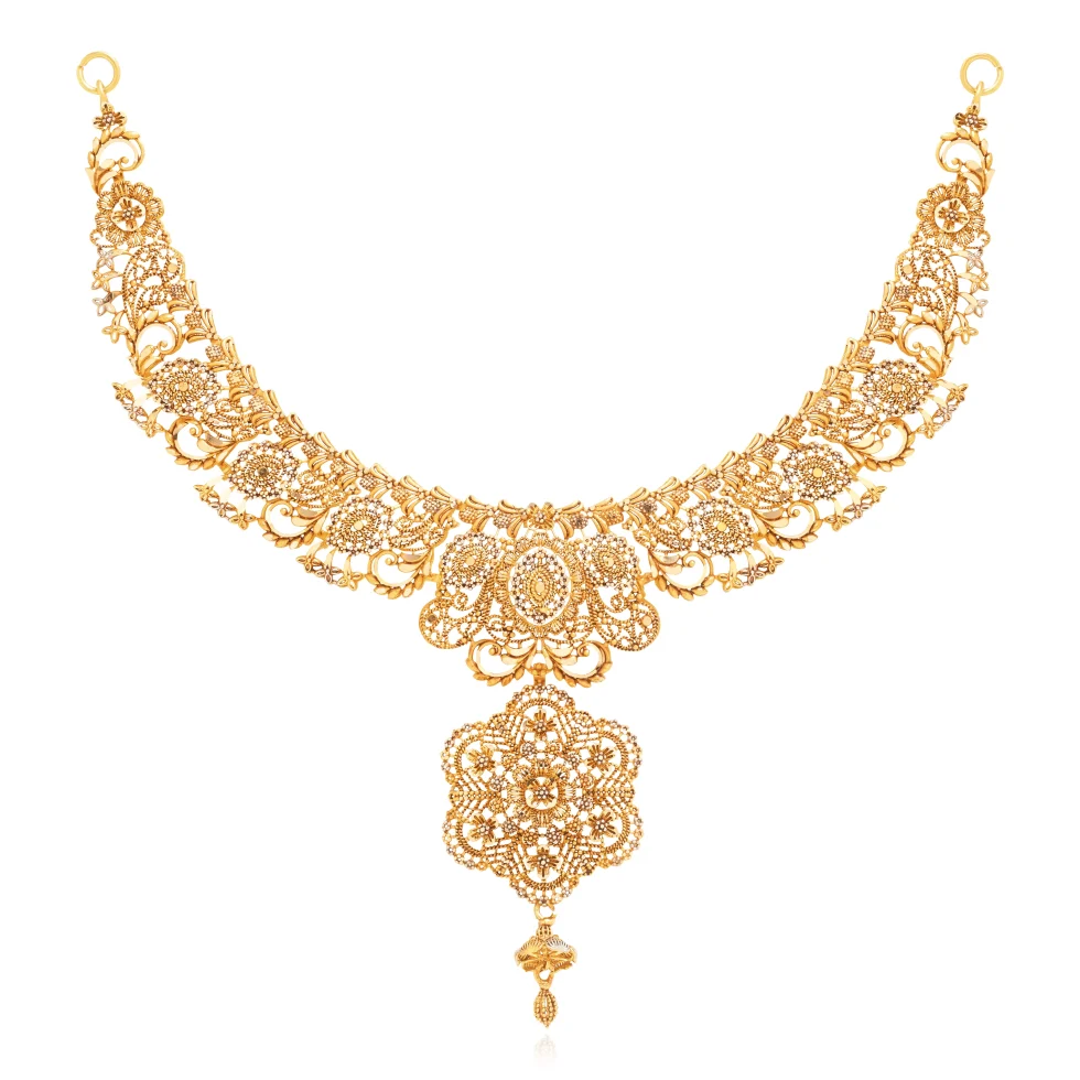 An exquisitely detailed necklace set crafted with lace-like filigree, blooming motifs, and layered artistry. The grand central pendant adds graceful movement, while the matching earrings complete a look that is regal, feminine, and timeless—perfect for a bride seeking refined heritage glamour.