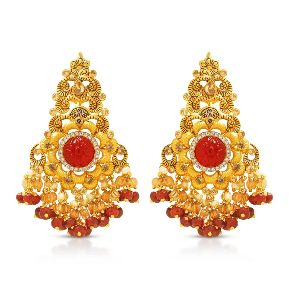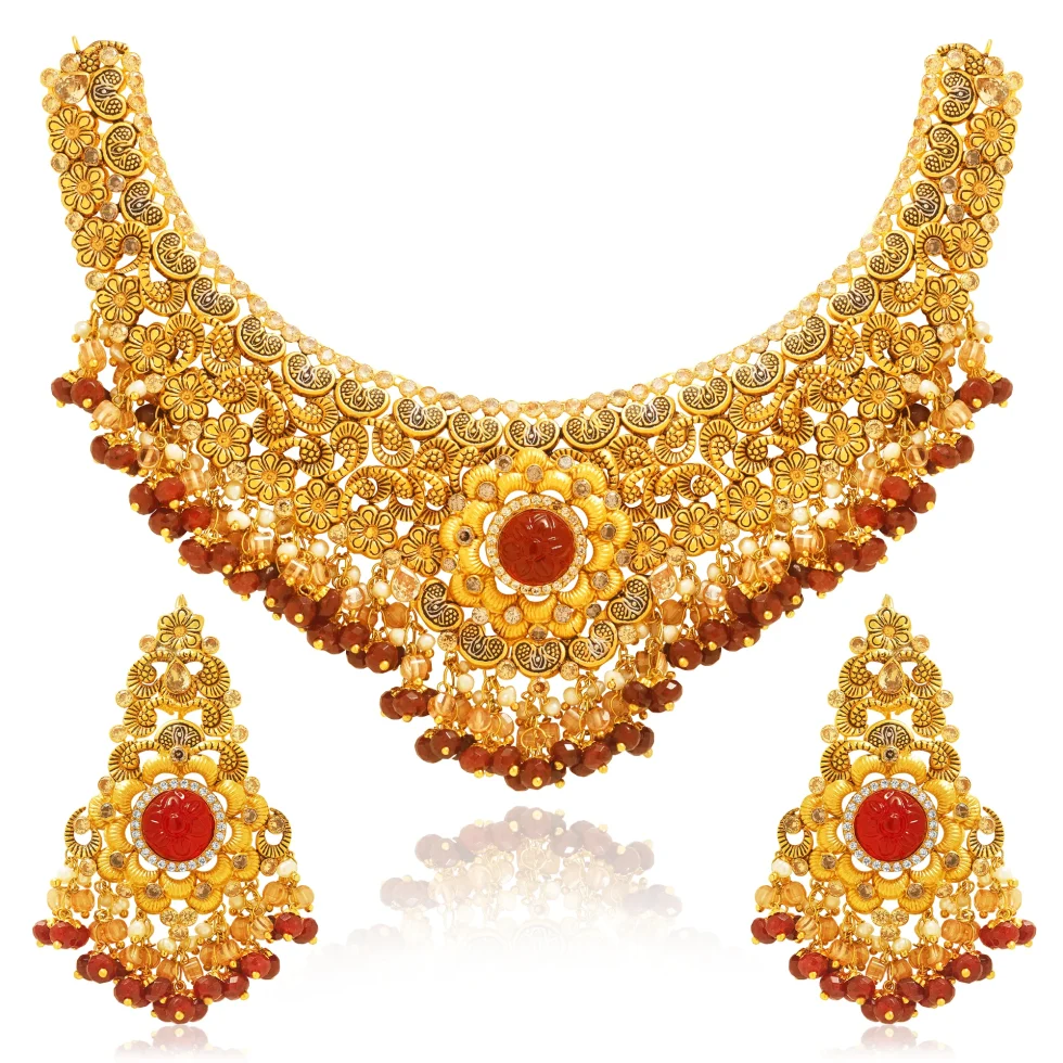 A lavish gold necklace set crafted with a tapestry of miniature floral motifs, scalloped patterns, and intricate textured detailing. The grand circular centerpiece features a bold red carved stone, creating a striking focal point framed by layered golden petals.