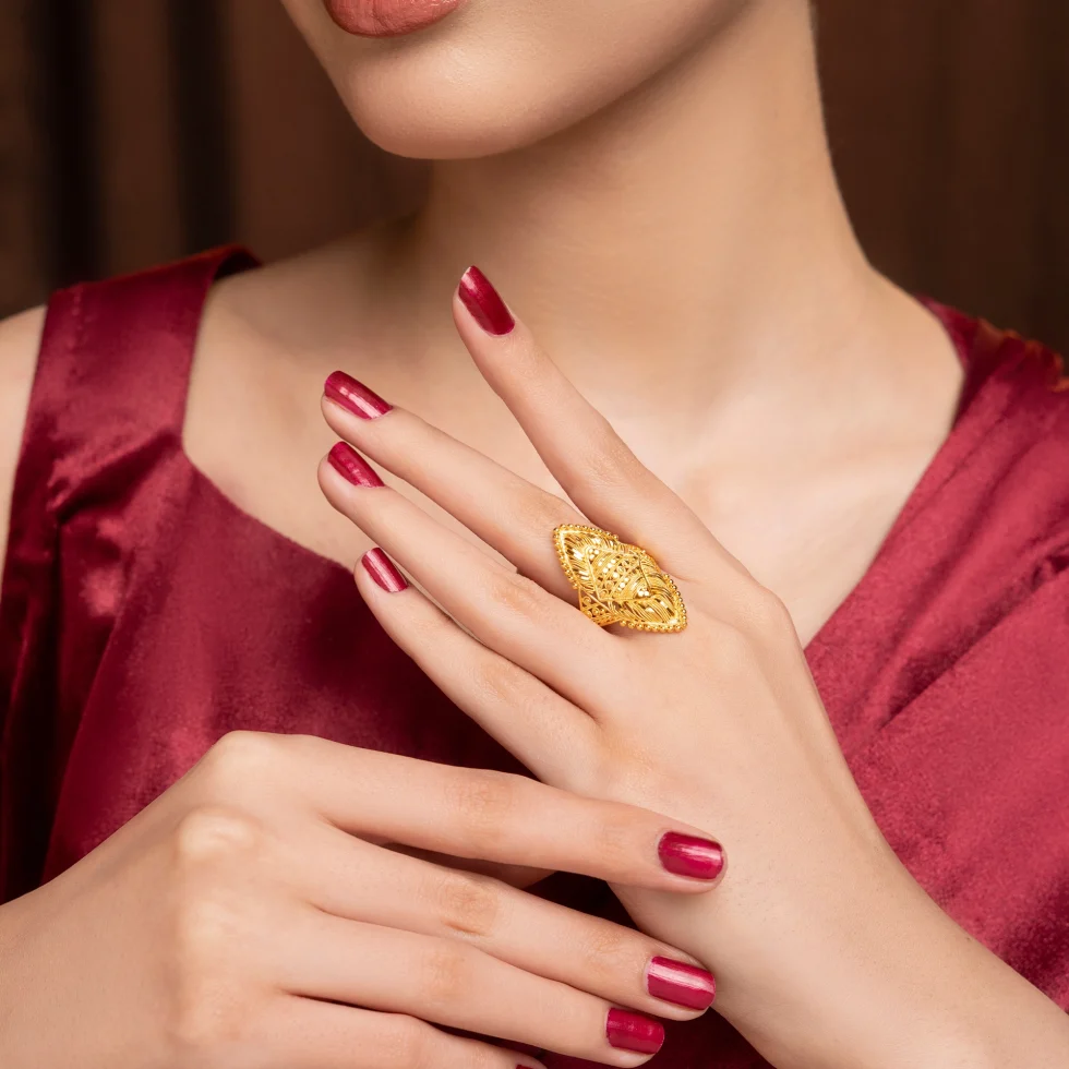 A sculpted leaf-like silhouette enriched with intricate filigree strokes and dotted accents, perfect for statement traditional styling. Its bold structure and textured detailing add depth and character, making it a standout piece for festive occasions.