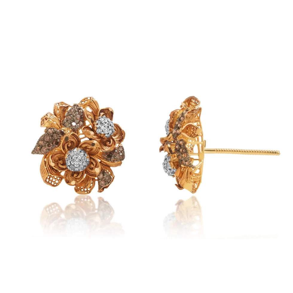 These exquisite gold tops are designed in a handcrafted floral pattern, featuring layered petal forms, scrolling details, and delicate openwork. The sculpted gold elements create depth and movement, giving the design a rich artisanal character.