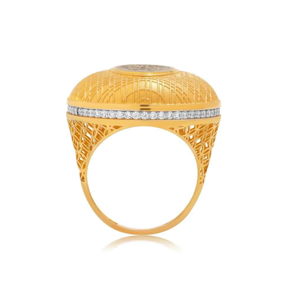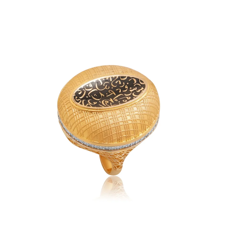 A bold domed silhouette adorned with a cross-textured pattern sets the stage for a striking oval of deep noir calligraphy at the center. The engraved script stands out beautifully against the darkened backdrop, adding contrast, meaning, and refinement.