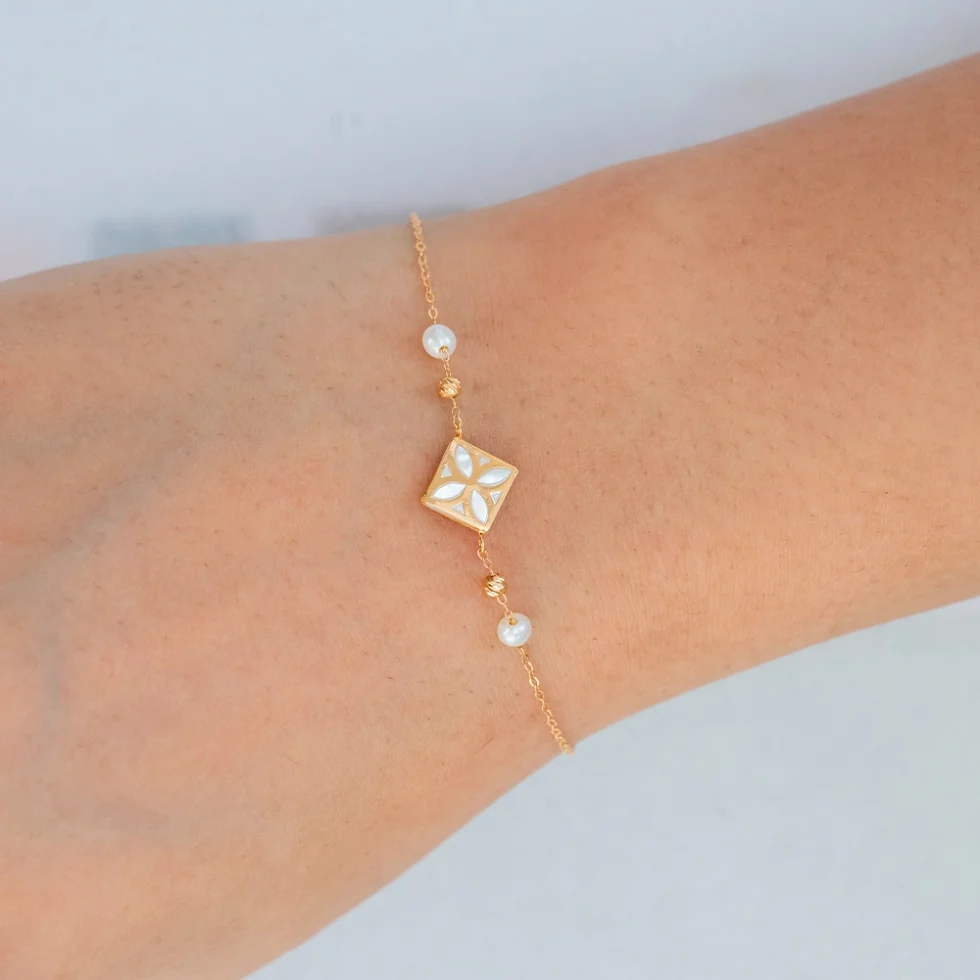 The NovaDot Bracelet features a refined square charm with a soft floral cutout in white enamel, framed in polished gold. Paired with alternating pearl and textured gold beads on a delicate chain, it offers a perfect balance of structure and softness.