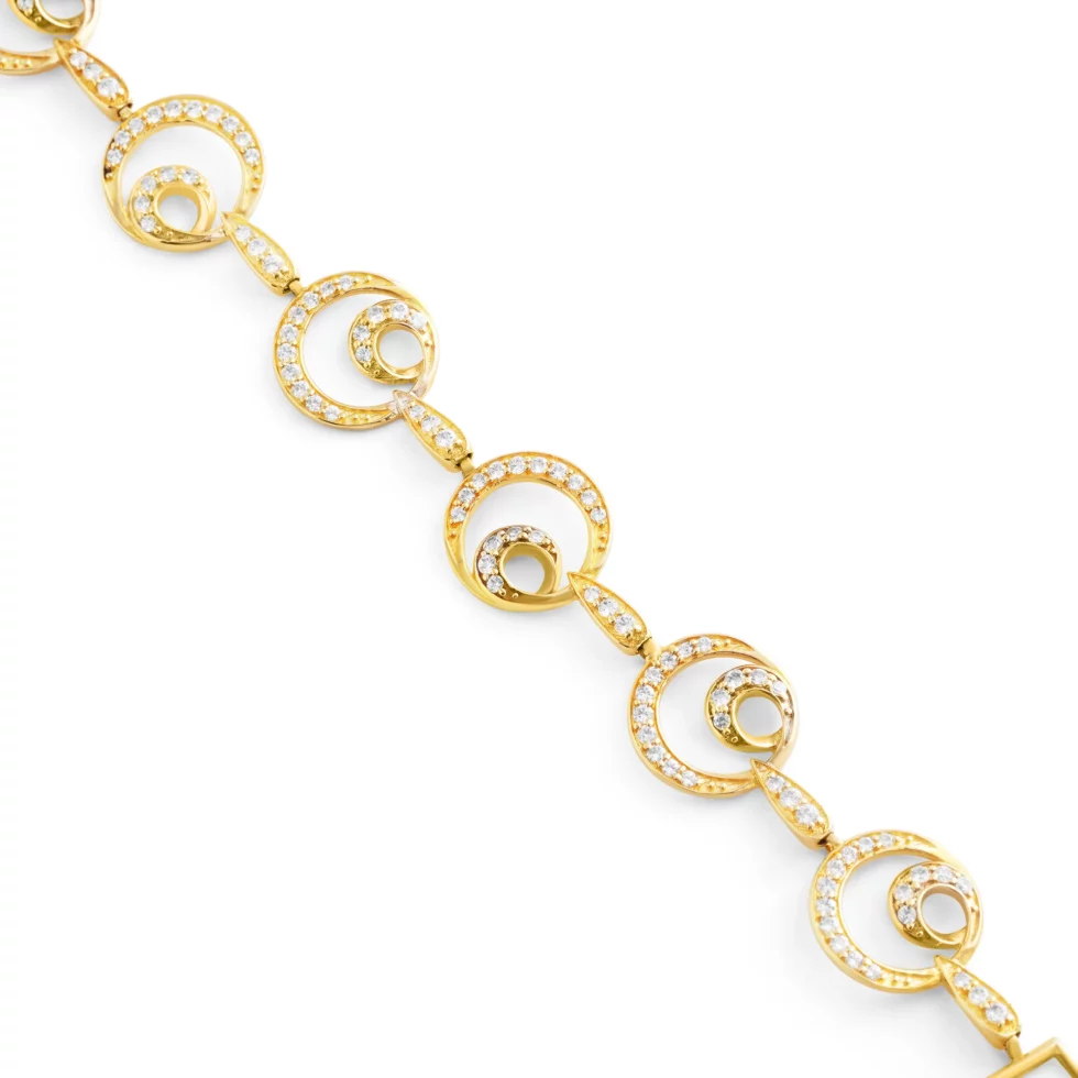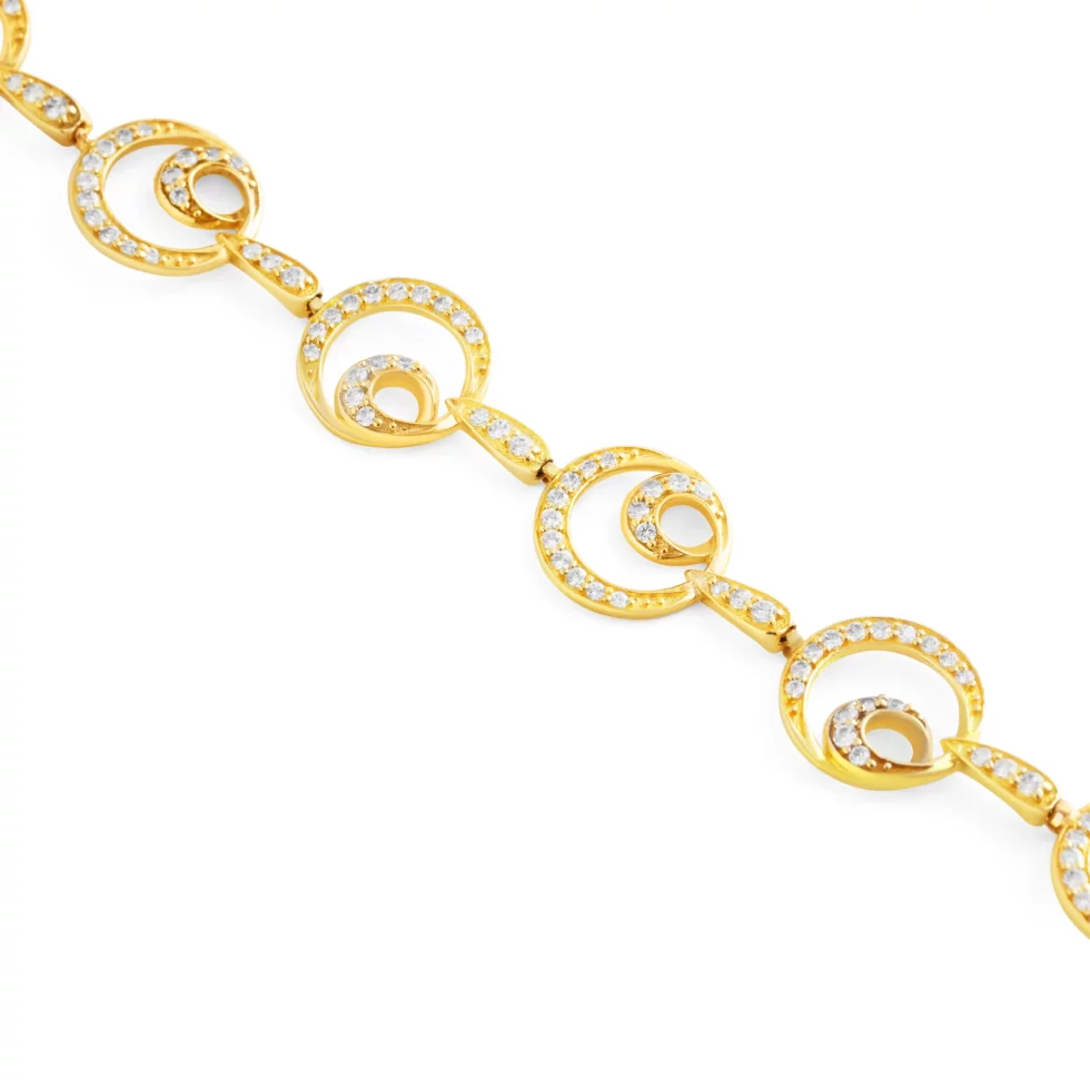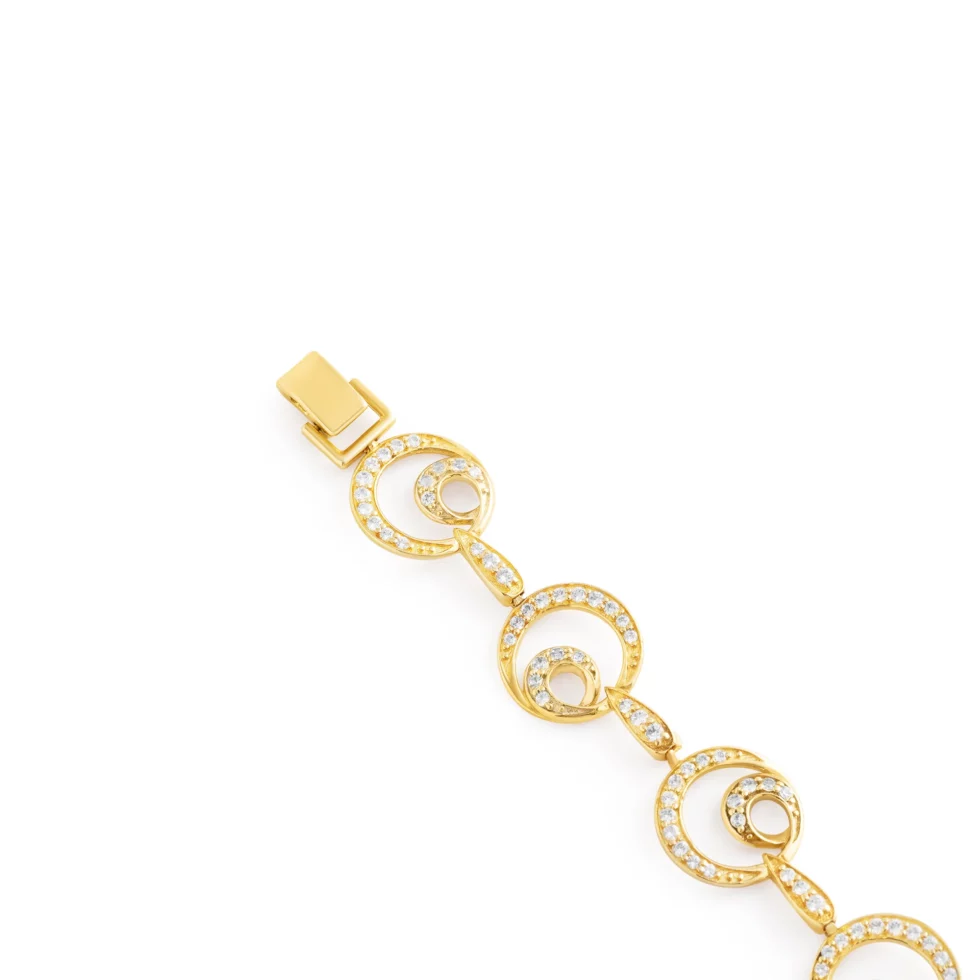 A captivating gold bracelet featuring interlocking concentric circles adorned with sparkling zircon stones. Each circle represents endless elegance and sophistication, making it a perfect piece for those who love timeless designs with a touch of brilliance.