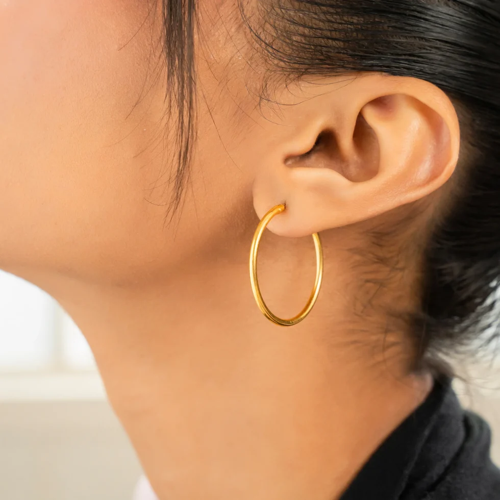 A symbol of strength in simplicity, these hoops embody the timeless allure of pure gold. Designed with a clean, fluid silhouette, they celebrate minimalism while exuding quiet confidence. The polished finish enhances their golden glow, creating a versatile piece that transitions effortlessly from everyday wear to special occasions.