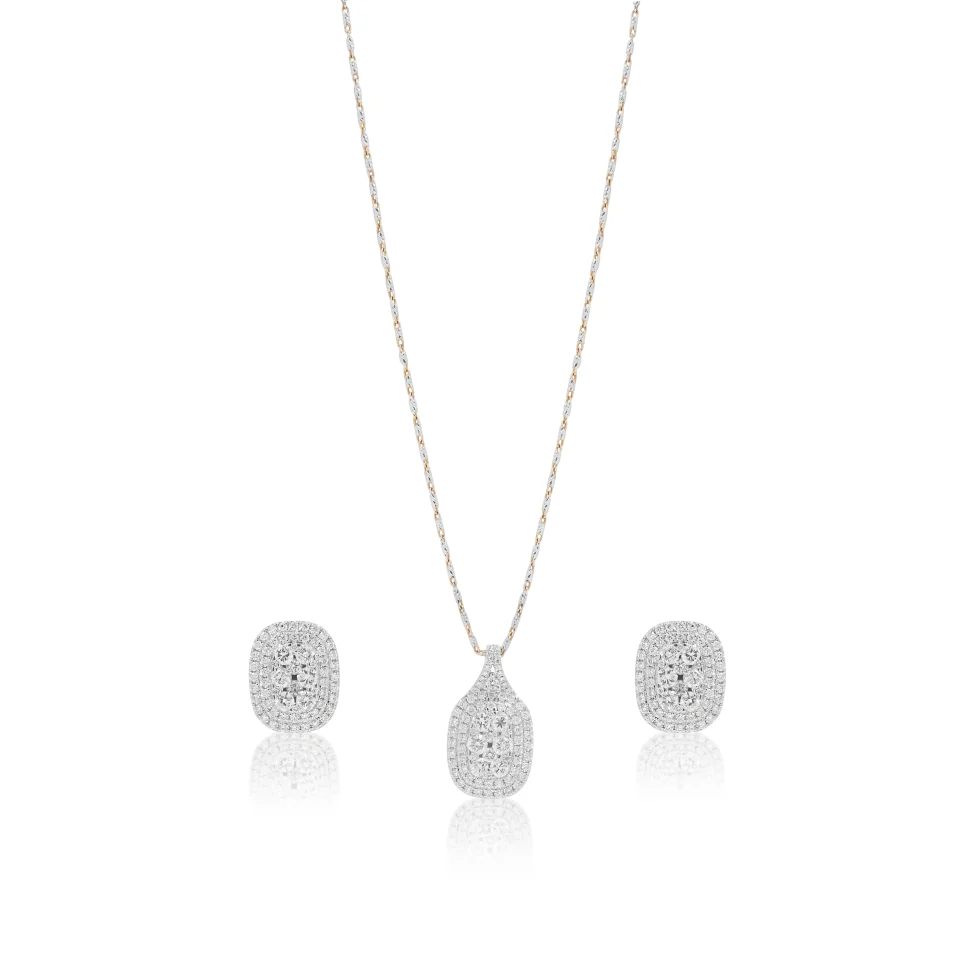 Designed with a refined oval silhouette, this diamond pendant set showcases precision-set diamonds arranged in a luminous frame. The matching earrings echo the same form, creating a balanced and polished ensemble.
