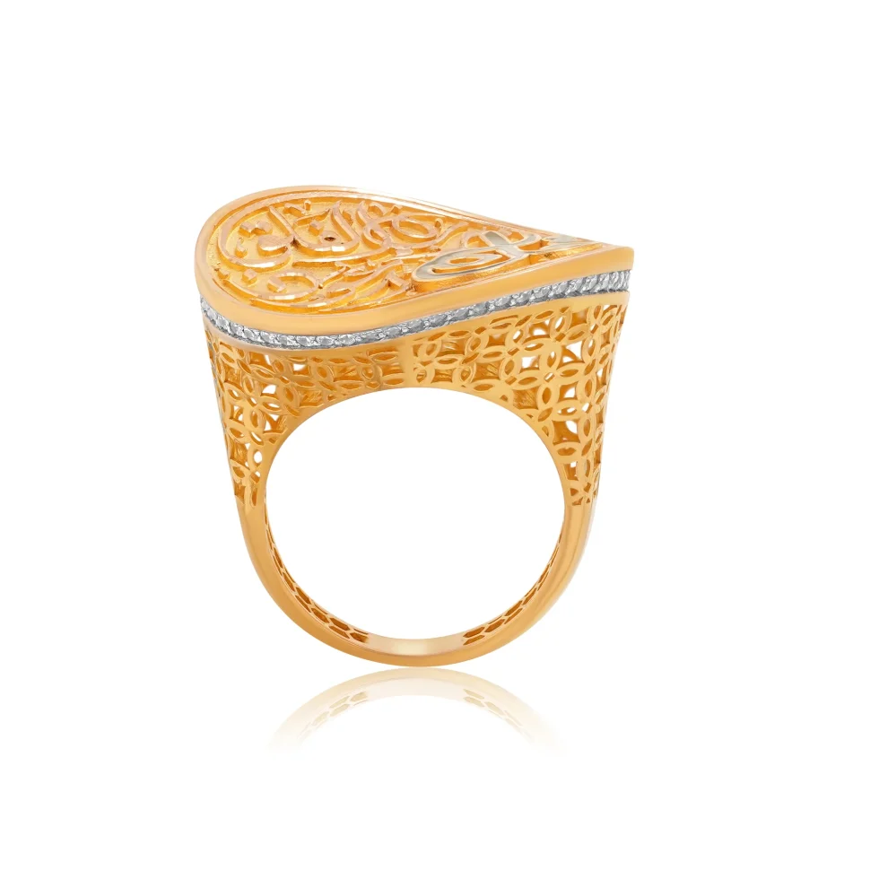 An oval crest of satin-finished gold becomes the canvas for beautifully layered Arabic calligraphy, masterfully engraved to create depth and movement. A bold green enamel stroke highlights the central inscription, bringing contrast, richness, and a sense of personal significance.