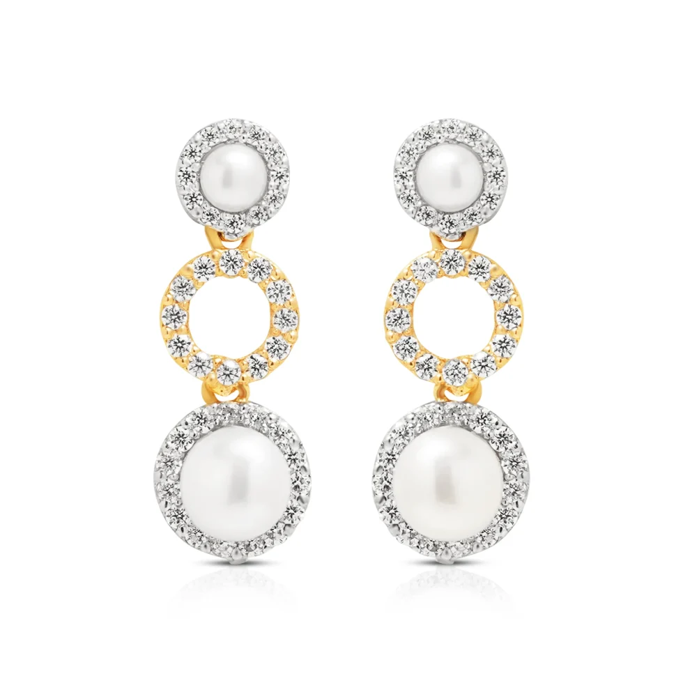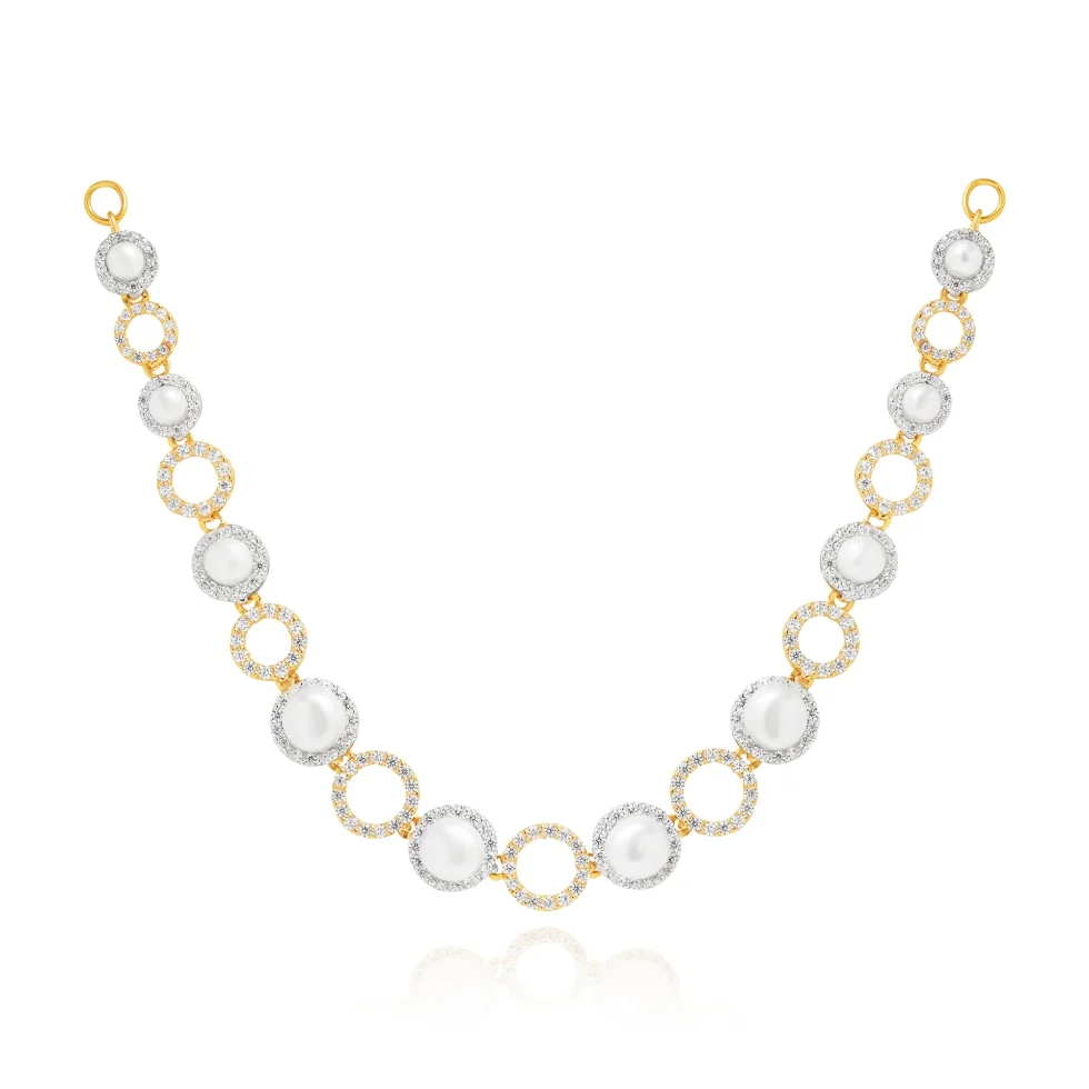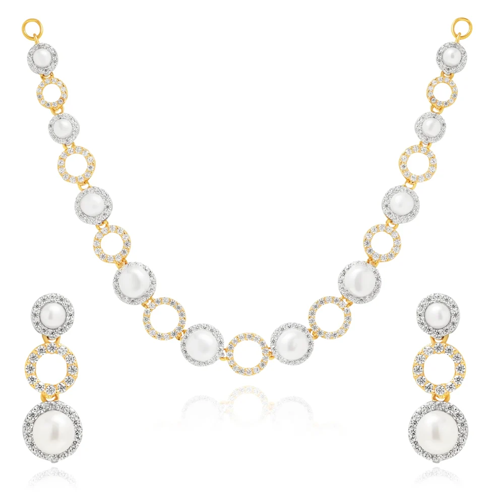 Crafted in polished gold, this necklace set showcases a seamless flow of circular links accented with luminous pearls and fine diamond detailing. The minimalist geometry gives the design a modern elegance, while the matching earrings complete the look with effortless harmony.