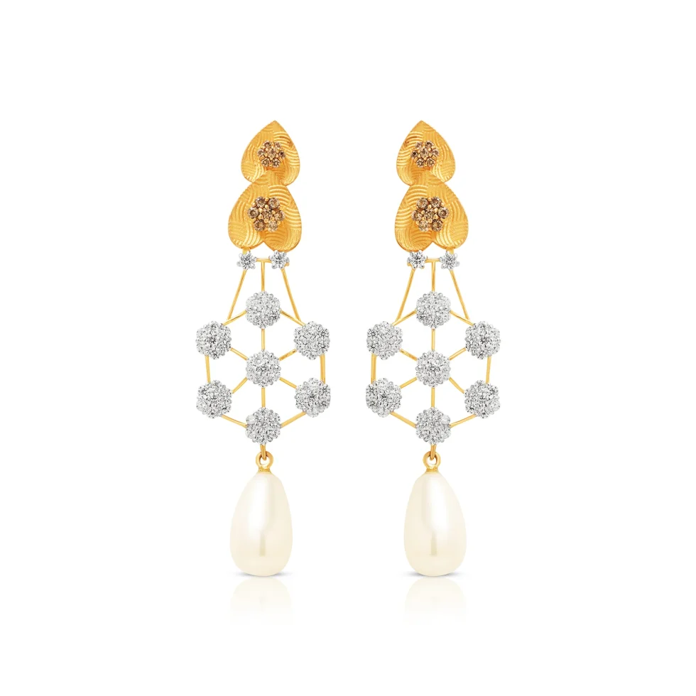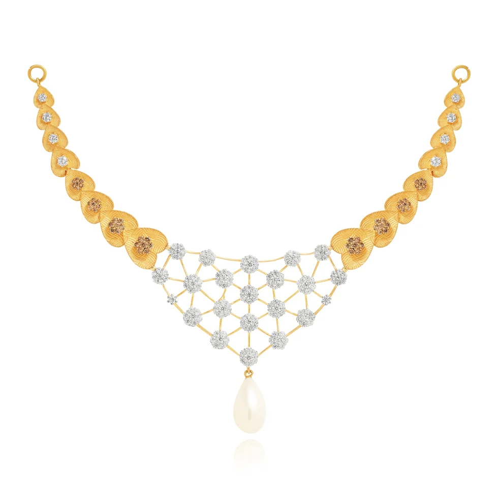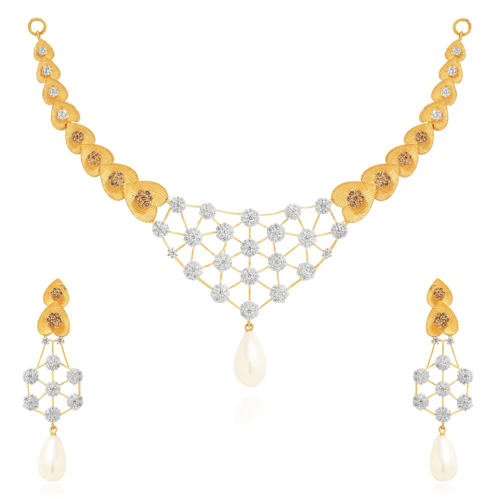 This exquisite necklace set is defined by its woven diamond framework suspended from richly textured gold elements. The structured pattern creates visual depth, enhanced by a single pearl drop that adds poise and balance. Finished with coordinating earrings, the set is a graceful choice for formal celebrations.