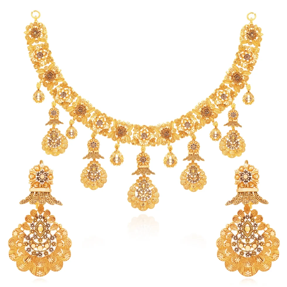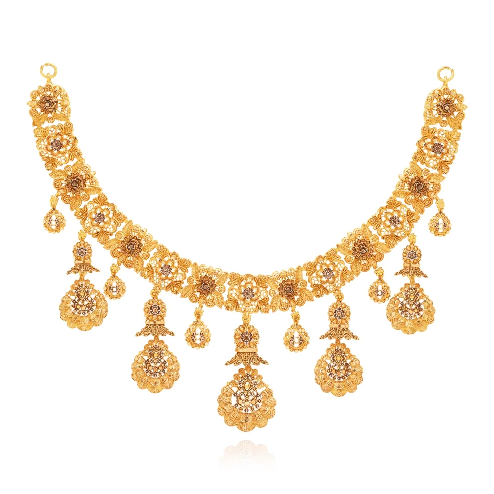 Crafted with intricate petal detailing and multiple suspended elements, this set embodies classic bridal grandeur. The rhythmic layout of florals and hanging motifs adds depth, making it a powerful statement for a bride who desires tradition with elegance.