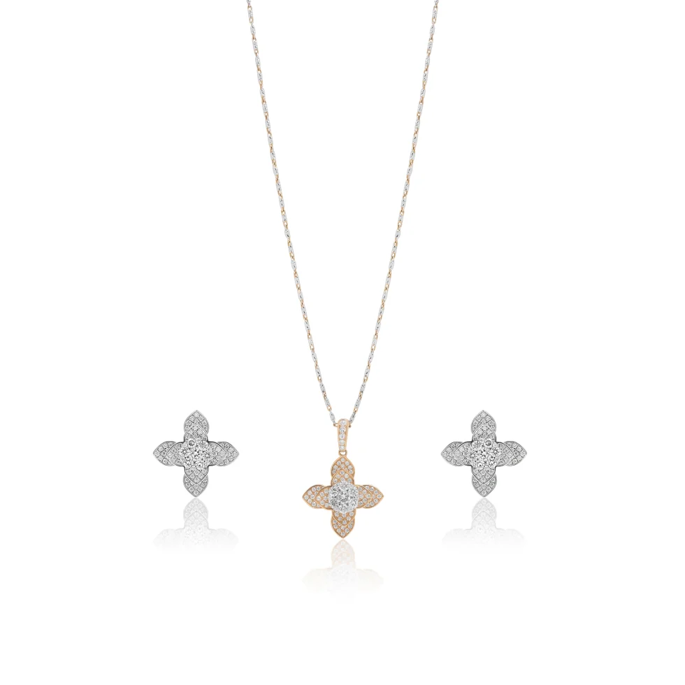 This locket set highlights a contemporary four-leaf motif crafted with precision-set diamonds. The clean design and matching earrings create a polished ensemble that transitions effortlessly from day to evening wear.