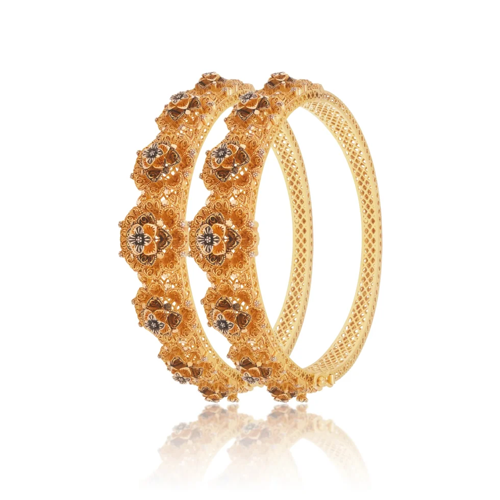 This opulent gold kara pair highlights bold floral clusters framed by intricate filigree borders. Crafted with precision, it offers a powerful bridal look with enduring heirloom appeal.