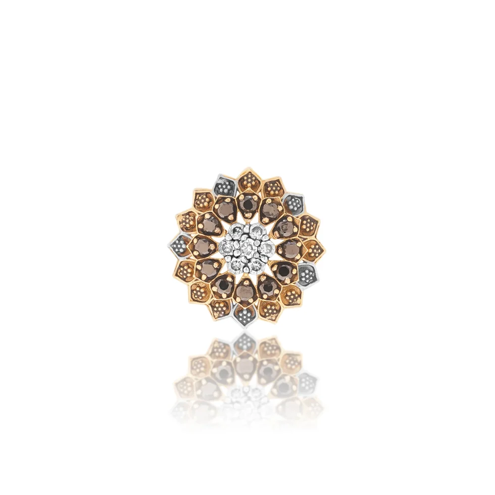 A striking medallion-style floral design where sculpted hexagonal petals circle a luminous central cluster. The layered detailing adds depth and sophistication, perfect for women who prefer classic forms with a modern twist.