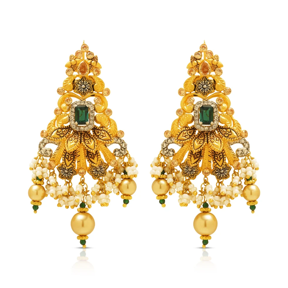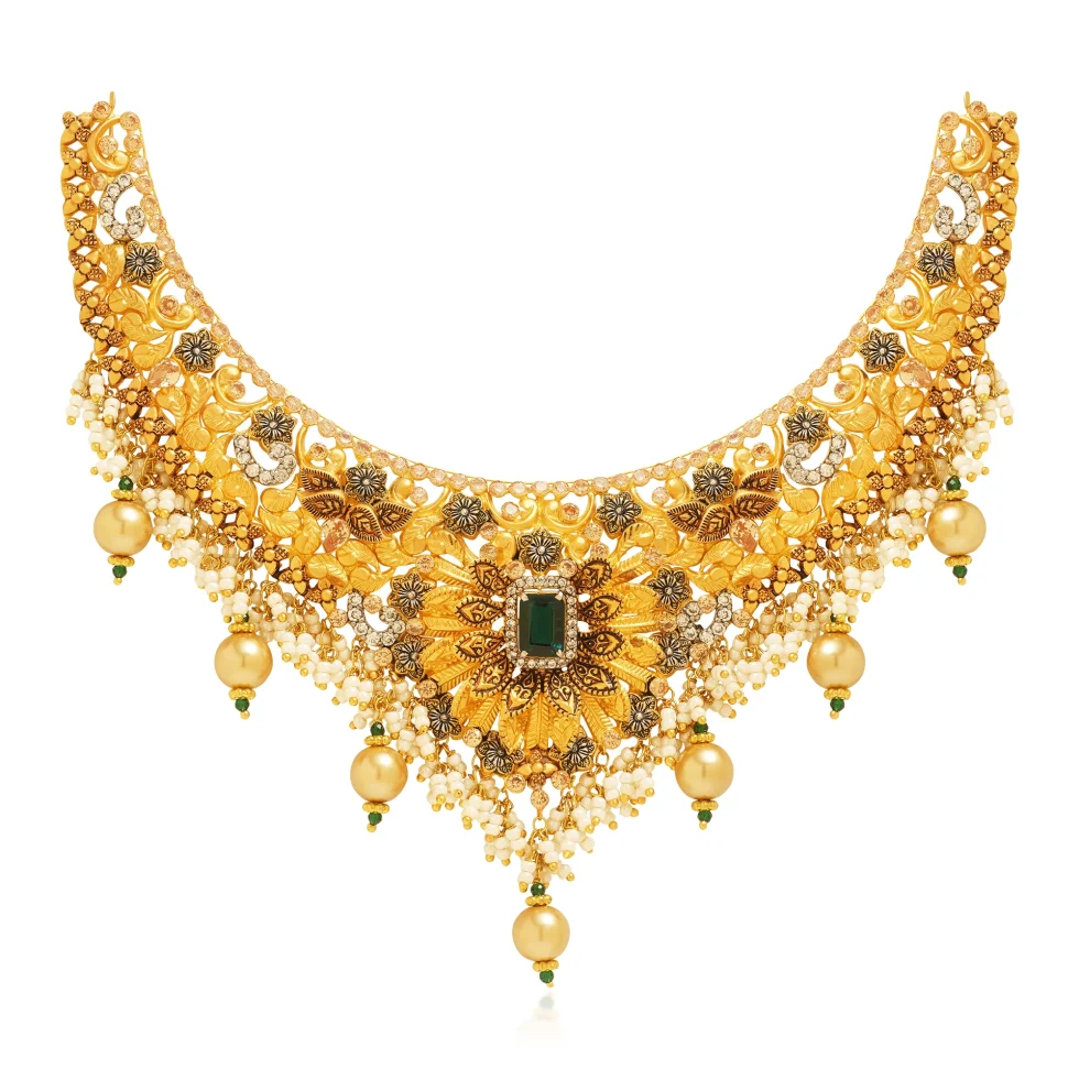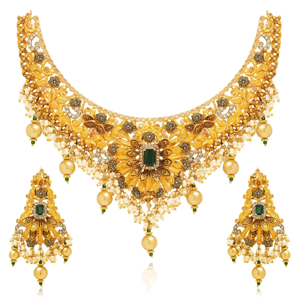 A majestic gold necklace set crafted with meticulous traditional detailing and rich artisanal texture. The wide crescent collar features layered floral motifs, sculpted leaves, and intricate filigree patterns, creating a luminous tapestry of gold craftsmanship.