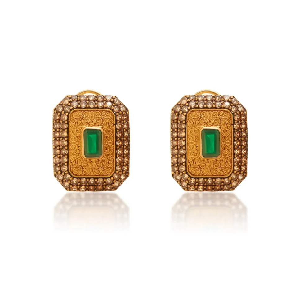 A timeless, heirloom-style design featuring a sculpted rectangle of antique-finish gold, wrapped in a frame of intricate beadwork. At the center rests a striking emerald-toned stone, adding depth, color, and royal charm. The detailed engravings enhance its vintage character, making these tops the perfect blend of classical artistry and bold elegance.