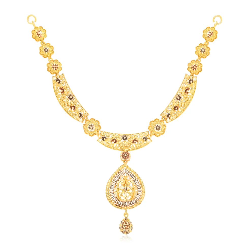Featuring delicately sculpted floral motifs and ornate gold panels, this necklace set offers a balanced blend of tradition and sophistication. Designed to elevate bridal and festive attire.