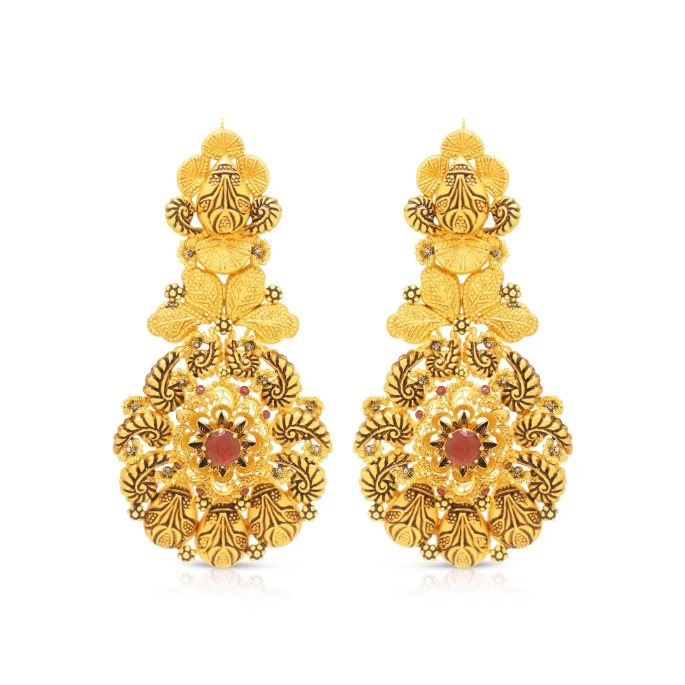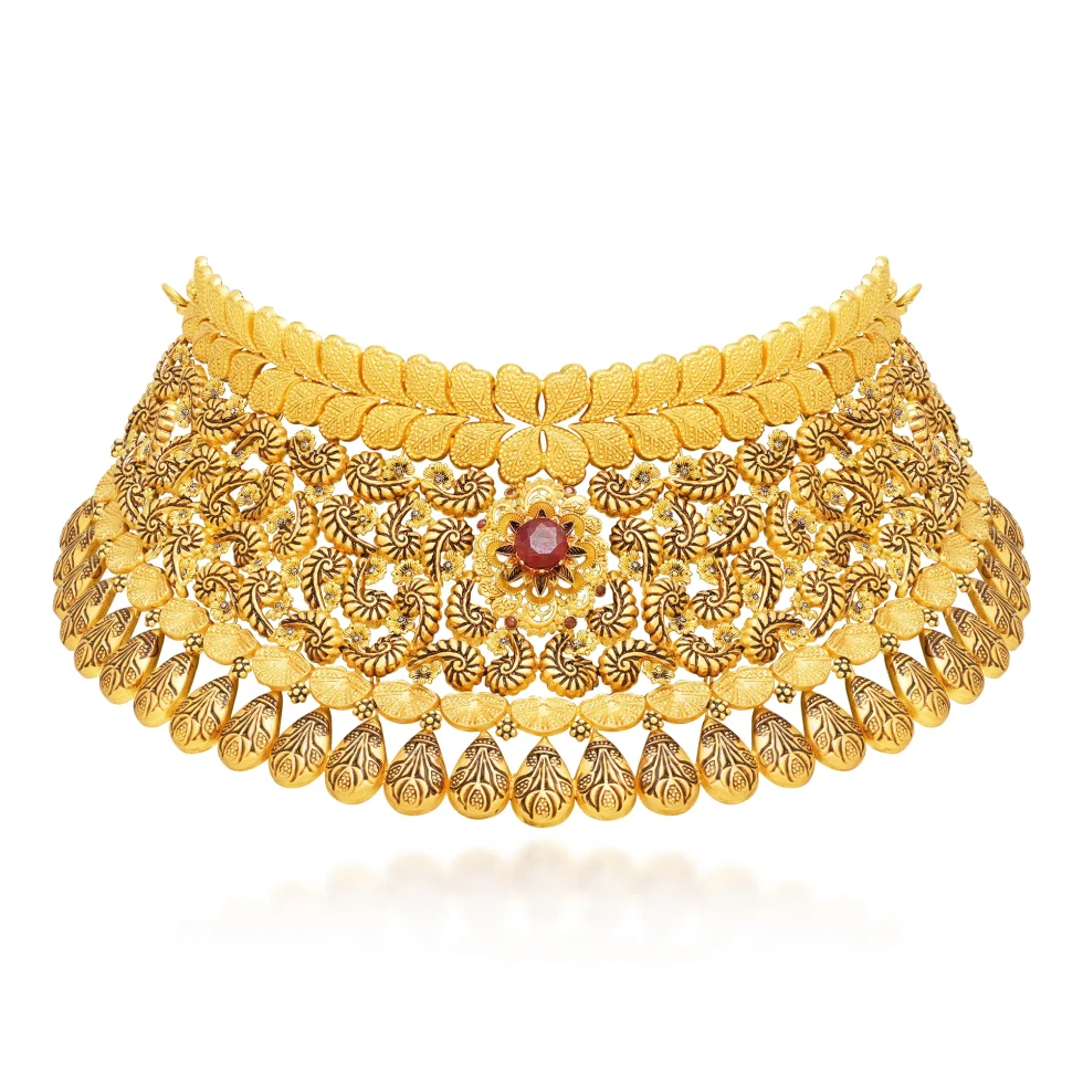 A grand fusion of lotus-inspired designs, scalloped detailing, and deep ruby accents. Its rich layering and ornate drops make it a standout piece for a heritage-inspired bridal ensemble.