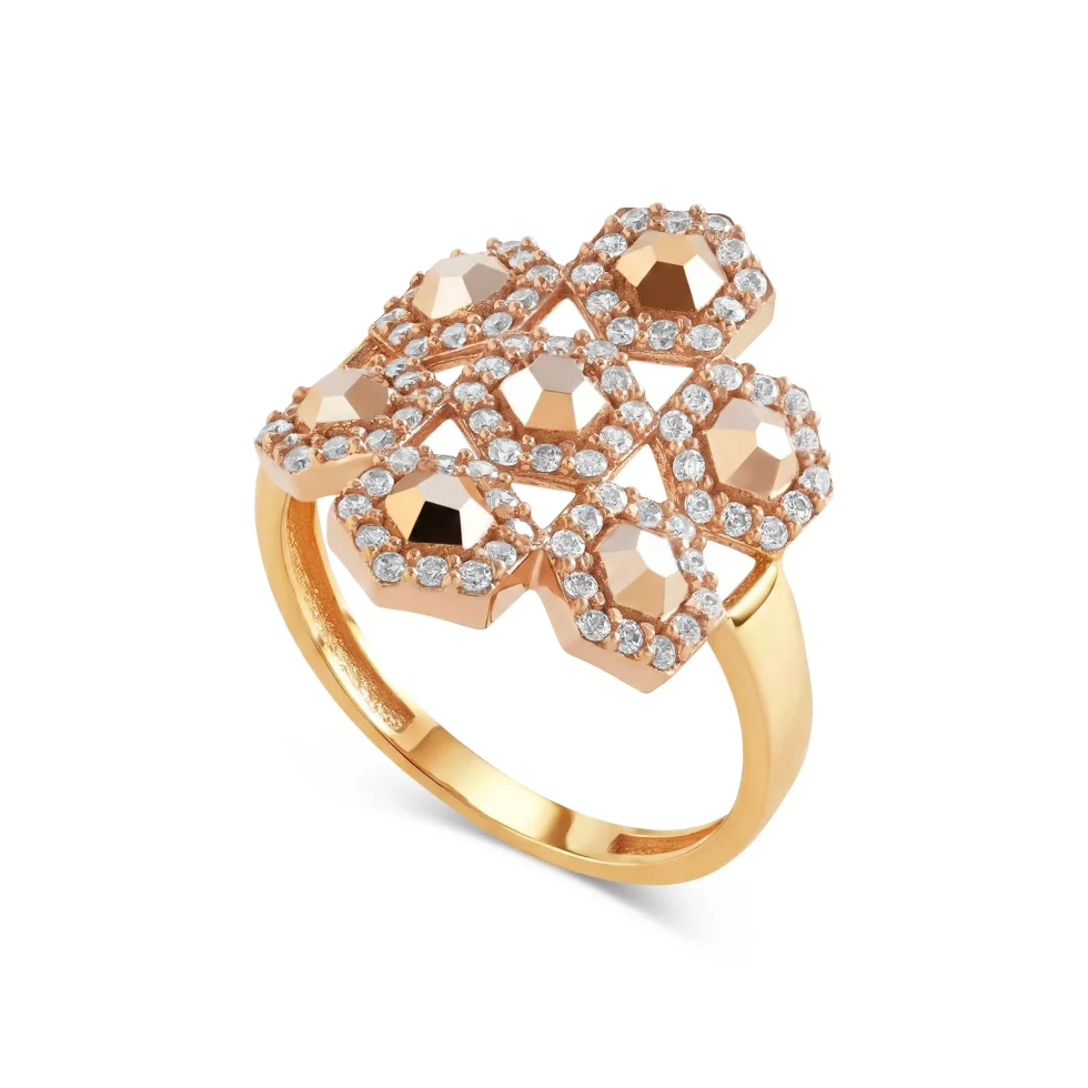 This striking gold ring features a sculpted grid of faceted rose-toned forms, each framed with fine pavé accents for added brilliance. The multi-layered arrangement creates depth and architectural balance, while the warm gold finish enhances its luxurious appeal.