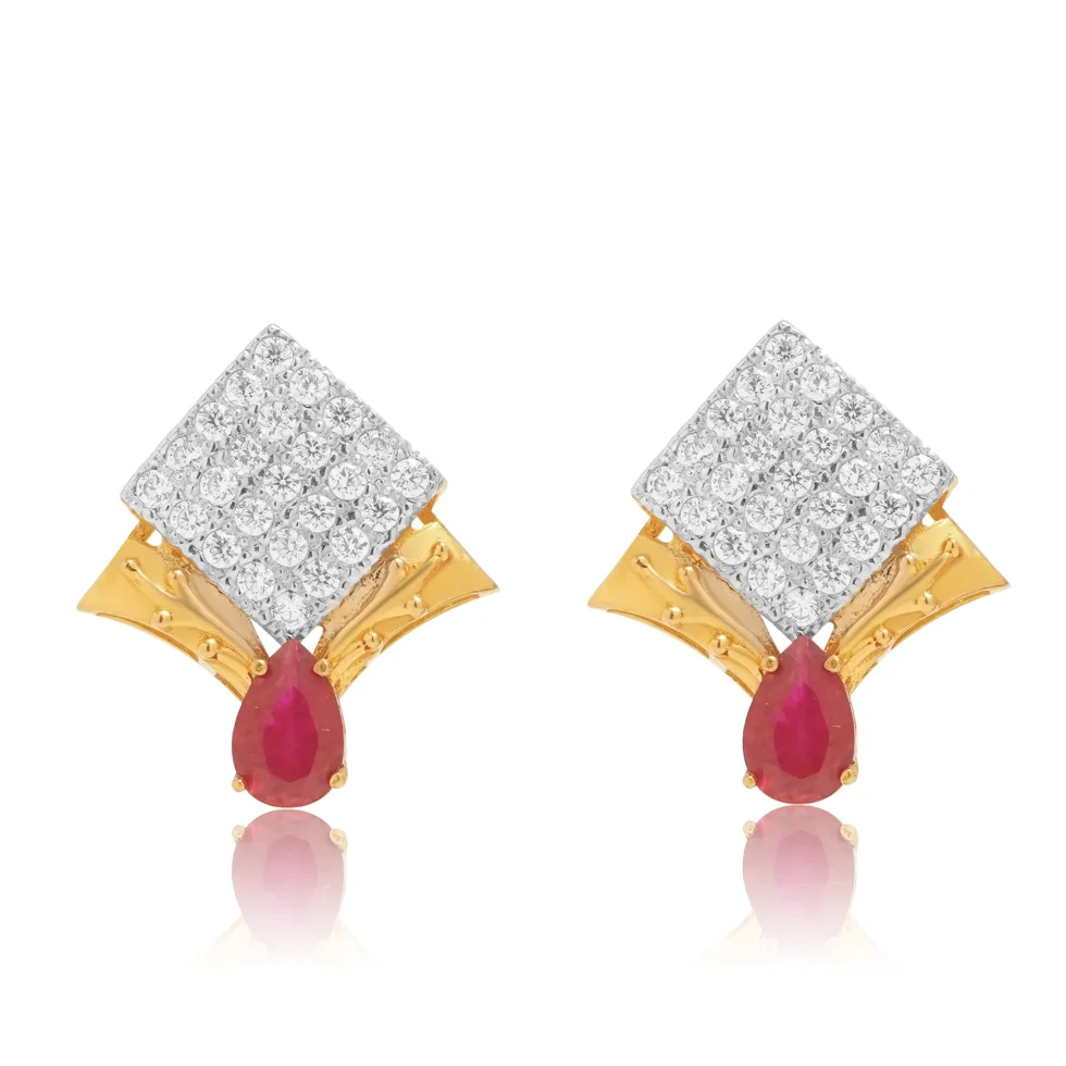 A radiant square of clustered diamonds contrasts elegantly with the warm gold fan design below, while a pear-shaped ruby adds a touch of royal drama. A stunning fusion of sparkle and heritage tones.