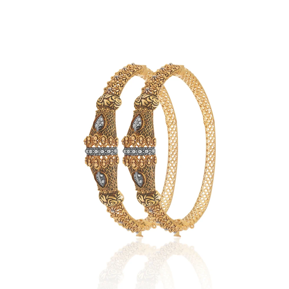 Designed with elaborate engravings and a pronounced centerpiece, this gold kara pair exudes regal elegance. The antique finish and fine craftsmanship create a powerful statement rooted in timeless tradition.