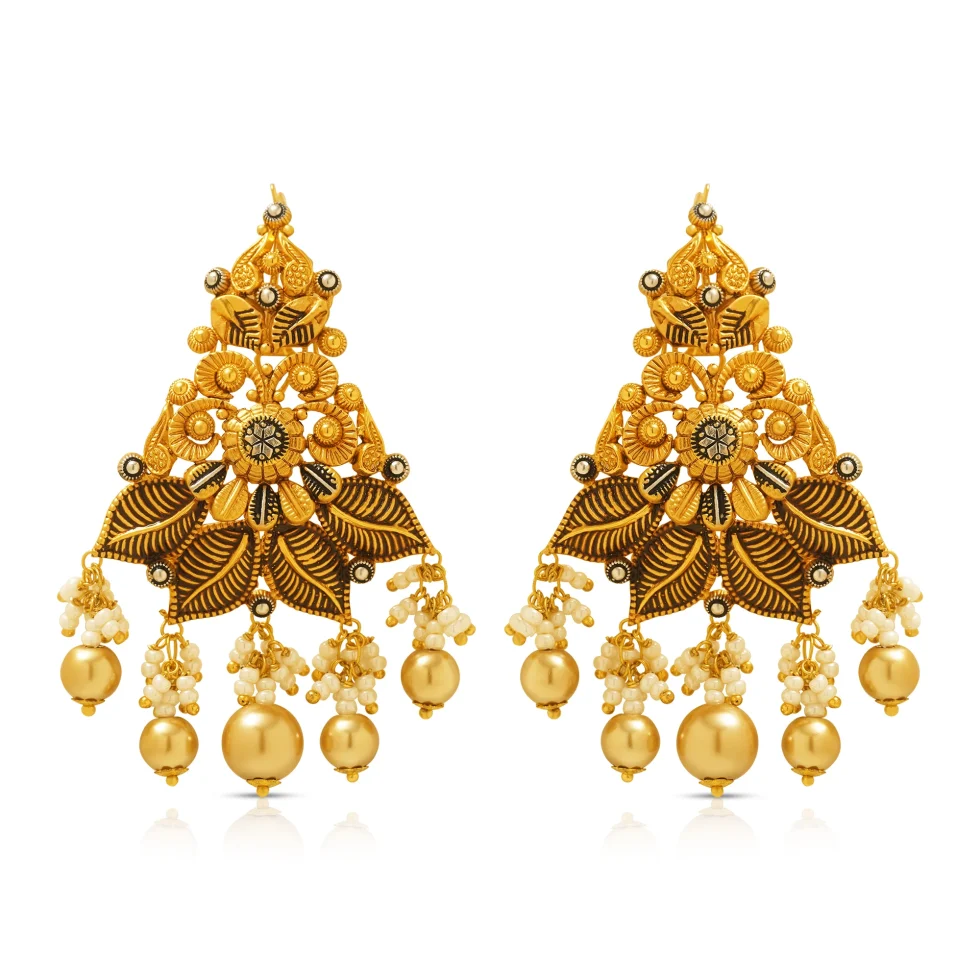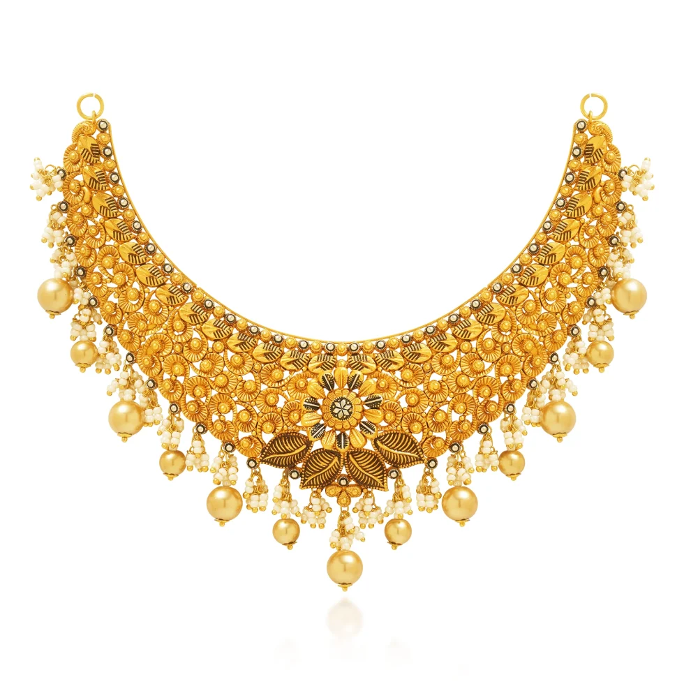 A breathtaking heritage-inspired necklace set crafted with intricate sunburst floral motifs and finely carved leaf details. The wide crescent collar is densely decorated with textured petals, creating a luminous tapestry of gold. Cascading pearl clusters and grand gold drops add movement and depth, enhancing its royal presence.