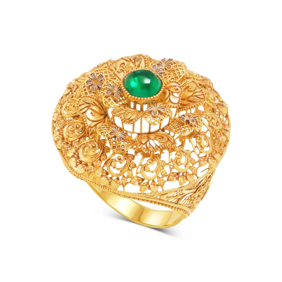 Featuring a luminous emerald-toned centrepiece atop an intricate dome of floral and paisley designs, this ring adds elegance and depth to festive and formal wear.