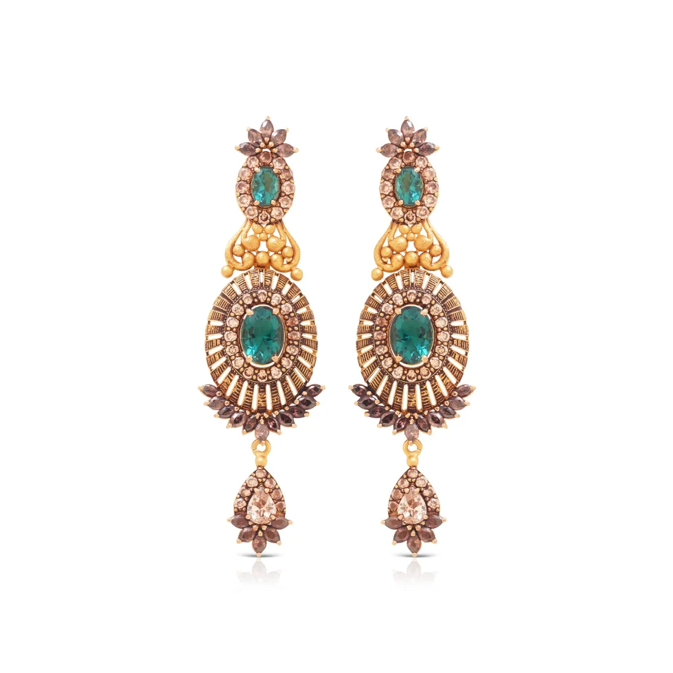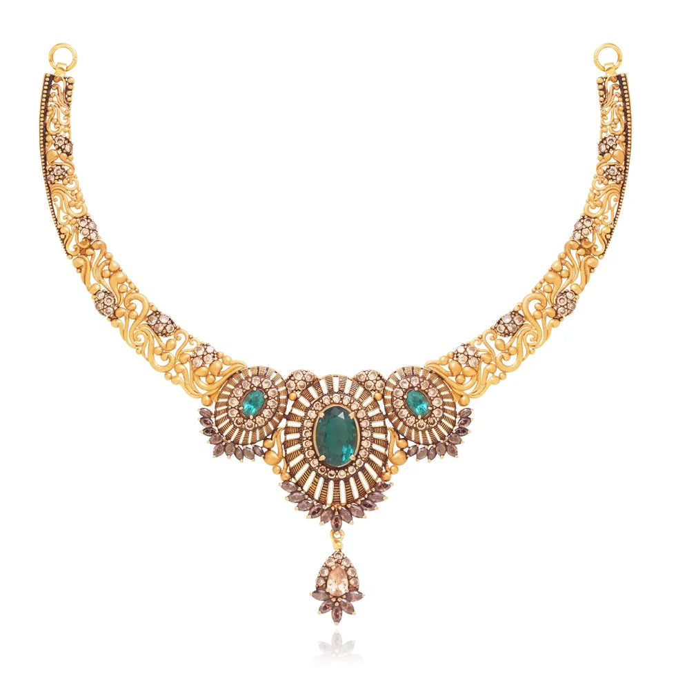 A striking composition of floral gold craftsmanship and deep green gemstone accents, the Majestic Emerald Set offers a bold yet graceful presence. Ideal for weddings and grand celebrations.