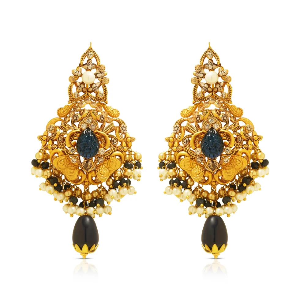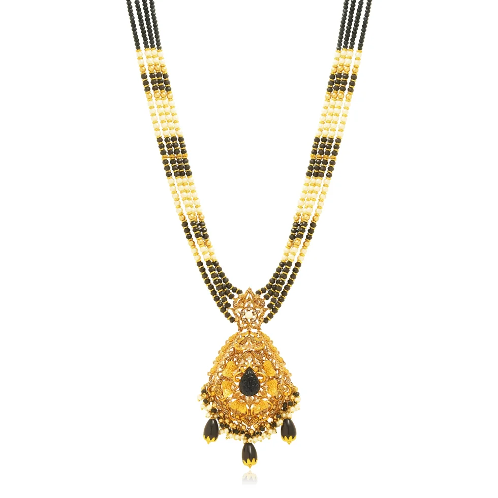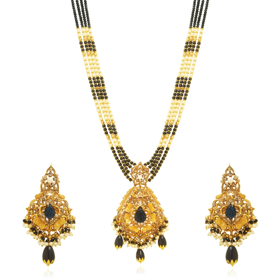 Fine filigree work, pearl accents, and bold black drops come together to create a necklace set that feels both majestic and dramatic. A perfect choice for brides or festive occasions that call for statement elegance.