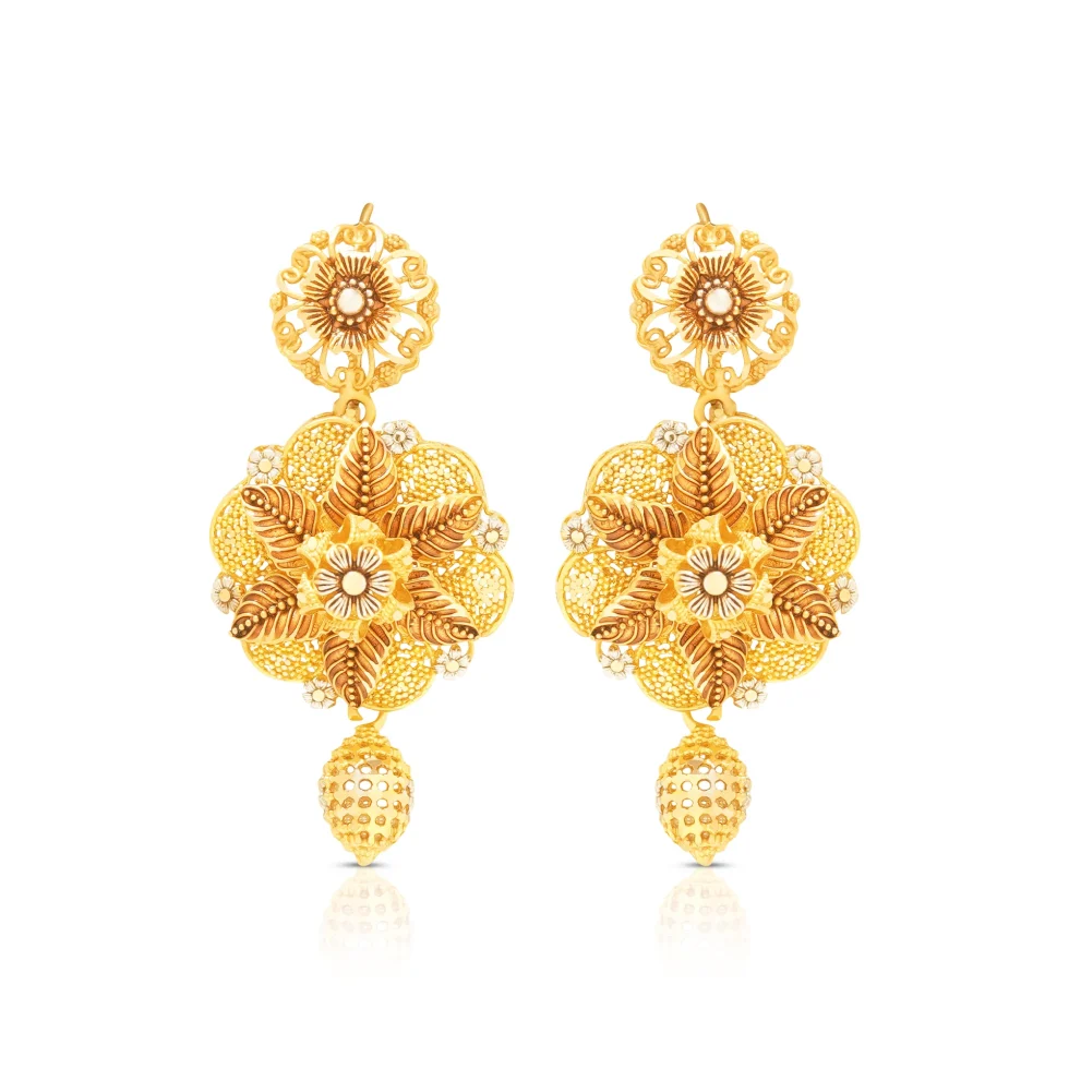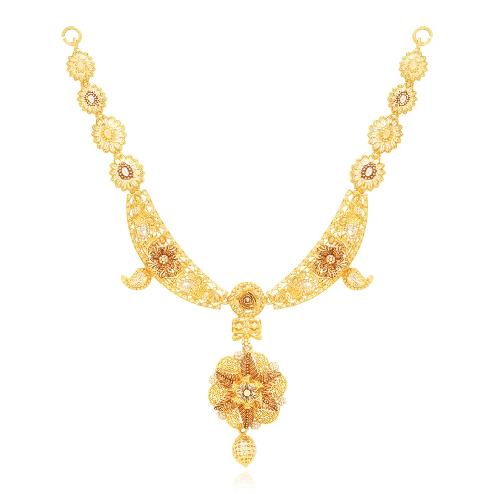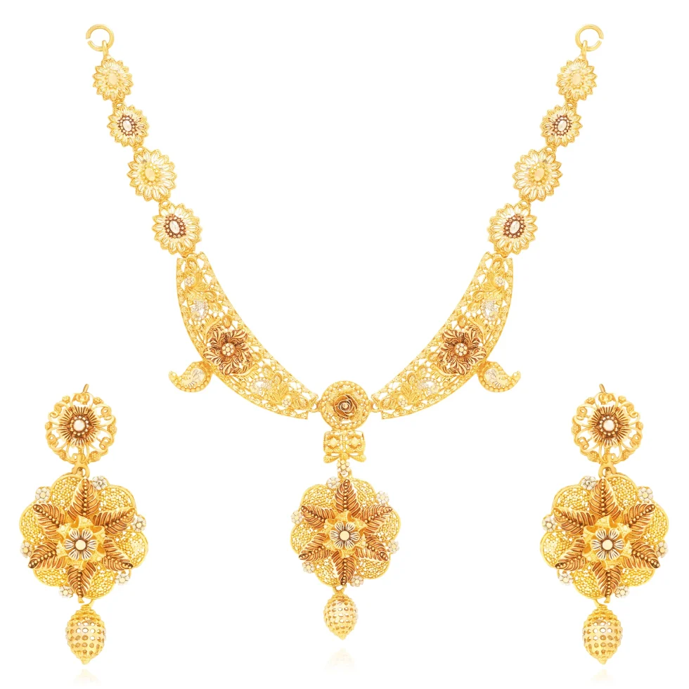 This necklace set features intricately carved petal motifs flowing into a beautifully detailed central pendant. The layered gold textures and floral accents reflect classic heritage, while the matching earrings complete the look with graceful balance. Ideal for weddings and formal celebrations.