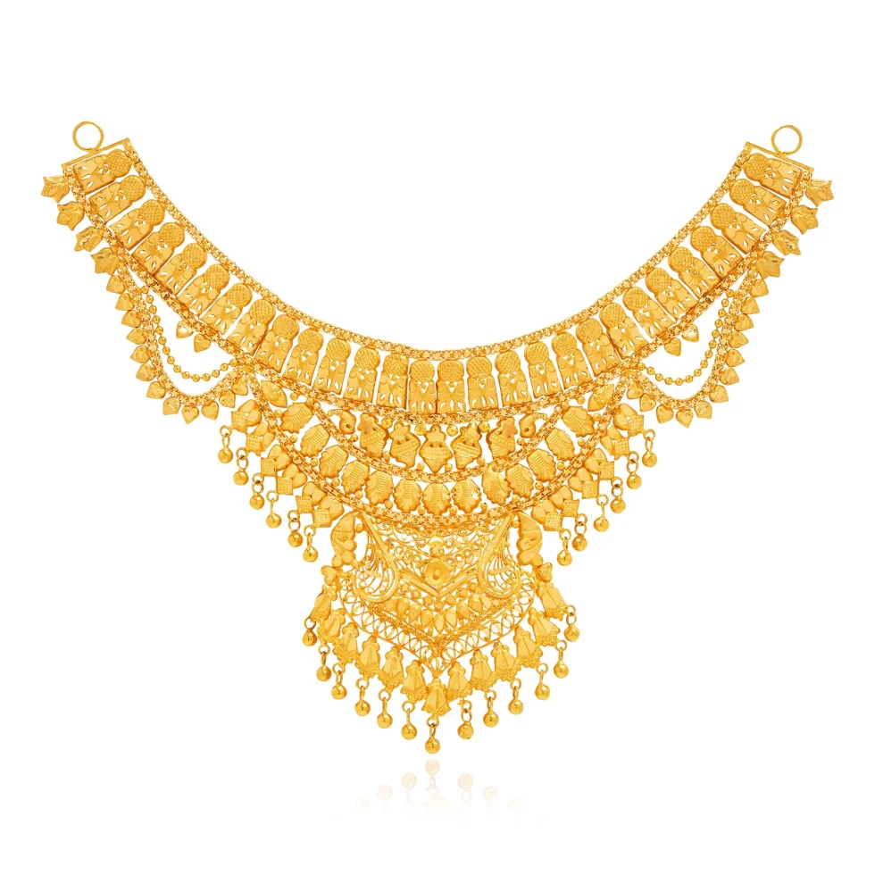 This statement gold necklace set combines layered traditional patterns with graceful dangling details. The matching earrings complete a look that embodies heritage, luxury, and enduring sophistication.