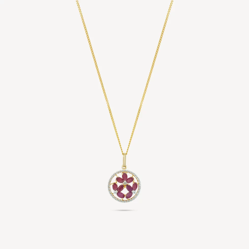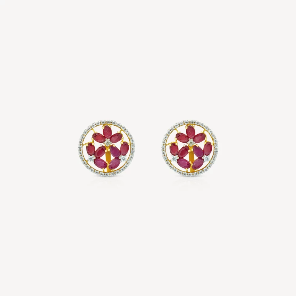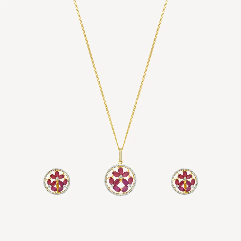 This exquisite “Ruby Bloom Set” radiates timeless charm with its floral-inspired design. The centerpiece features a circle of finely cut rubies, elegantly arranged in a blooming pattern, bordered by delicate zircon stones for a sparkling finish. Perfectly complemented with matching earrings, this gold set adds sophistication to any attire, making it a versatile choice for both festive celebrations and everyday elegance.