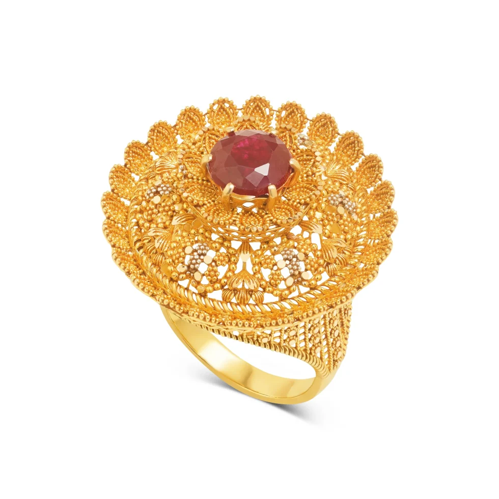 A beautifully detailed gold ring showcasing a radiant ruby at its heart, framed by layered floral textures and delicate beadwork crafted for bold, elegant occasions.