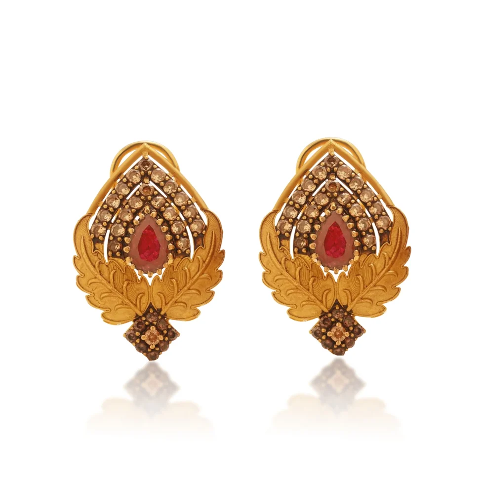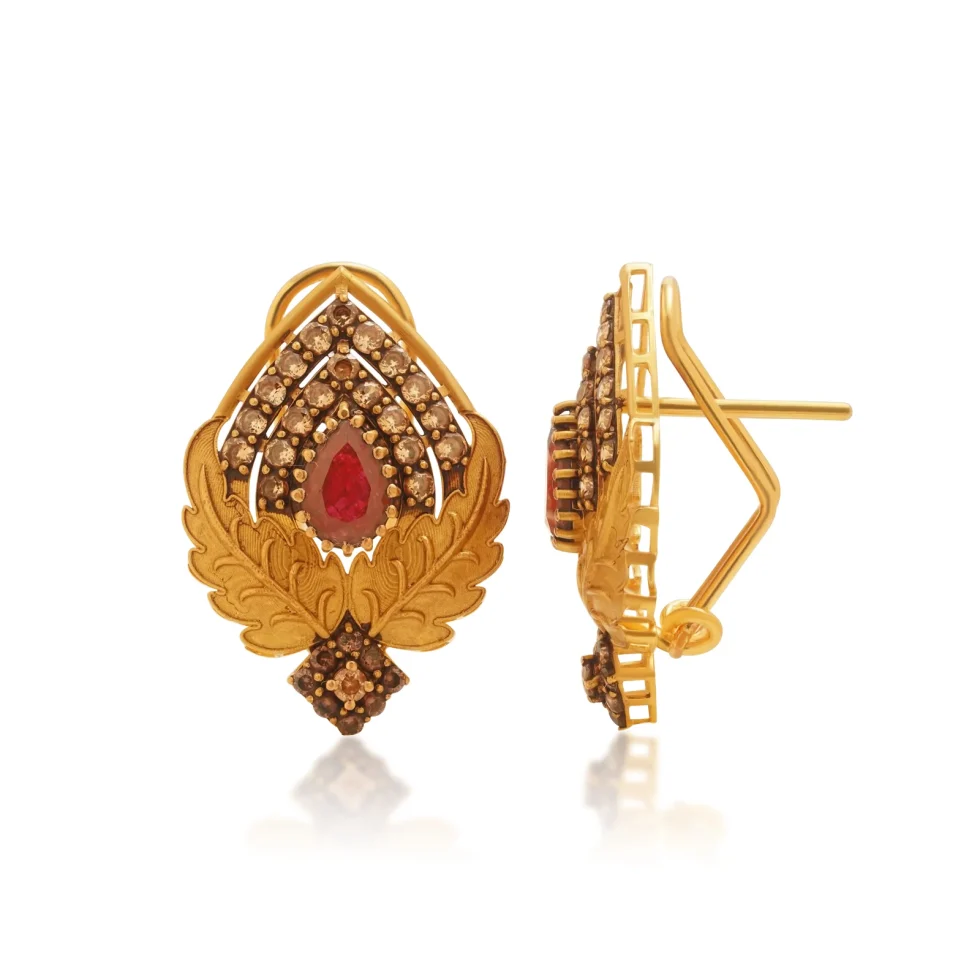 A teardrop ruby glows beneath tiers of micro-beaded gold, embraced by smooth, sweeping leaf motifs. The refined craftsmanship and rich palette make it perfect for festive and formal elegance.